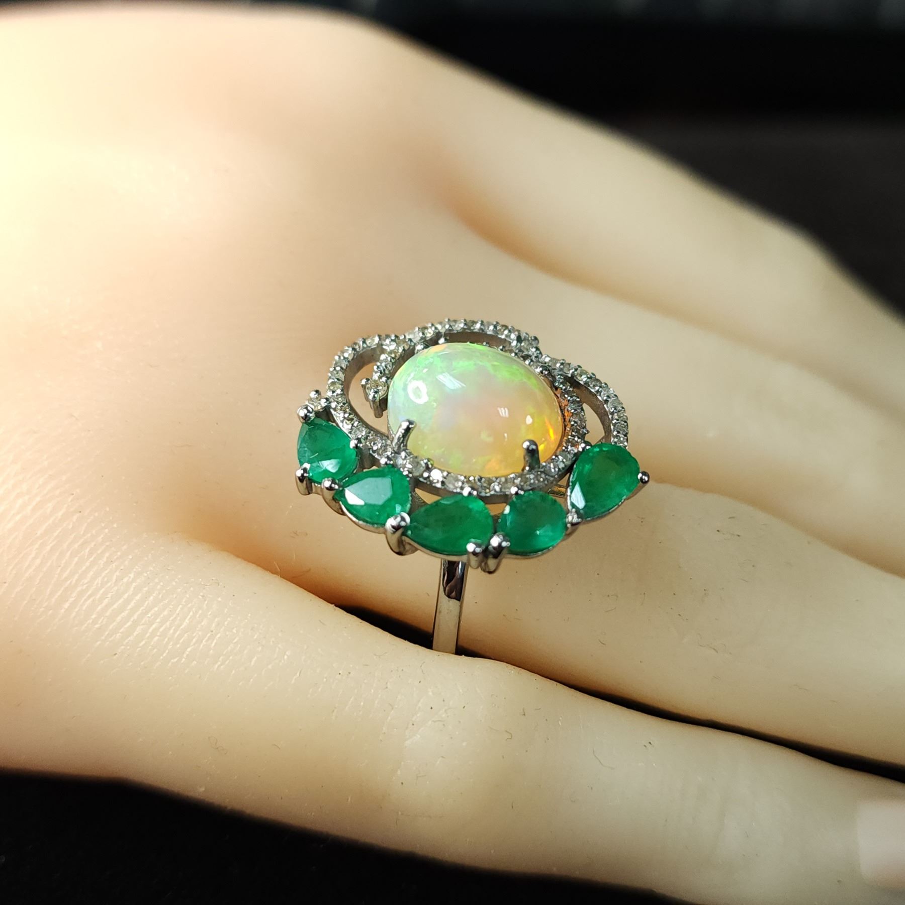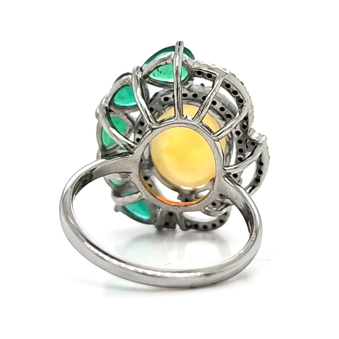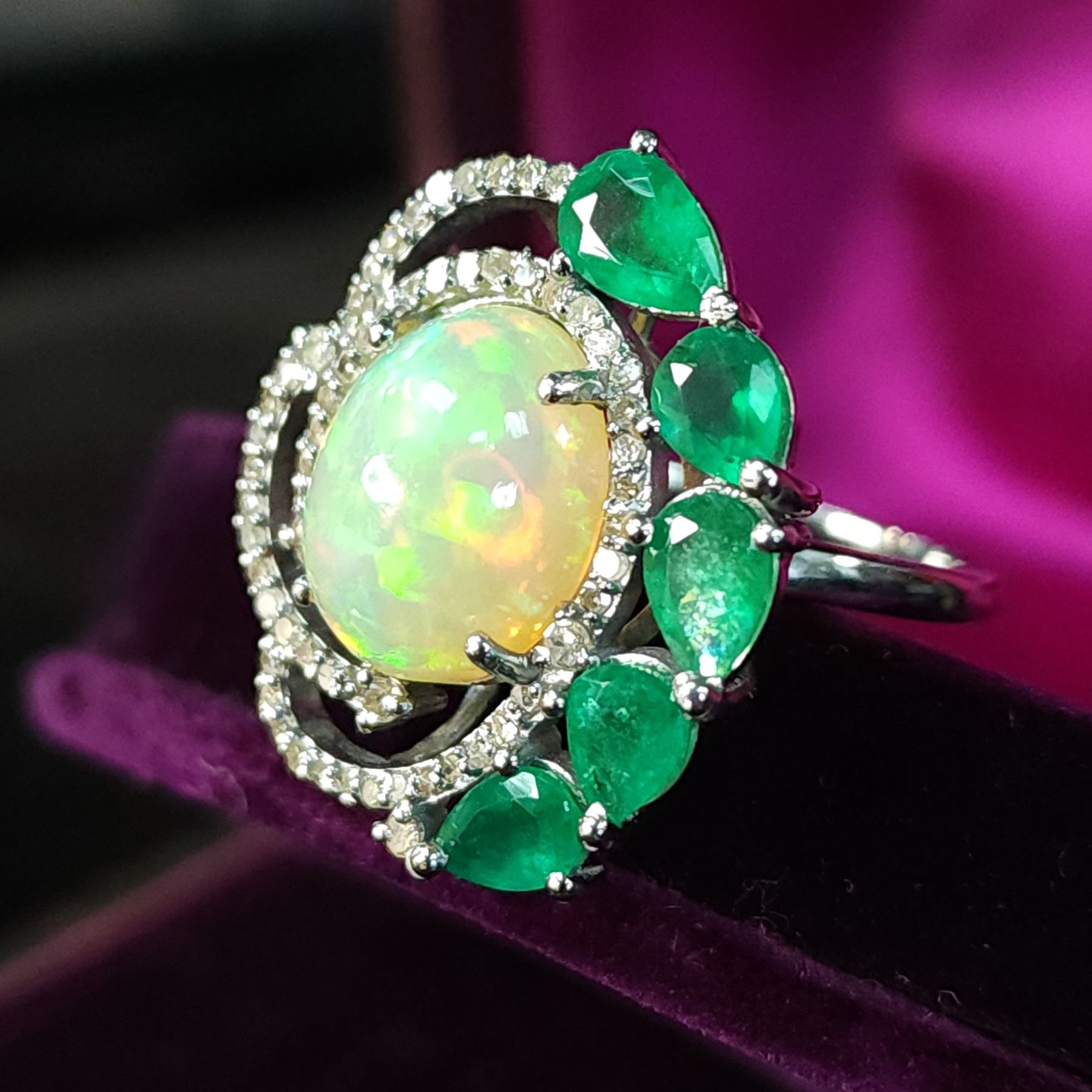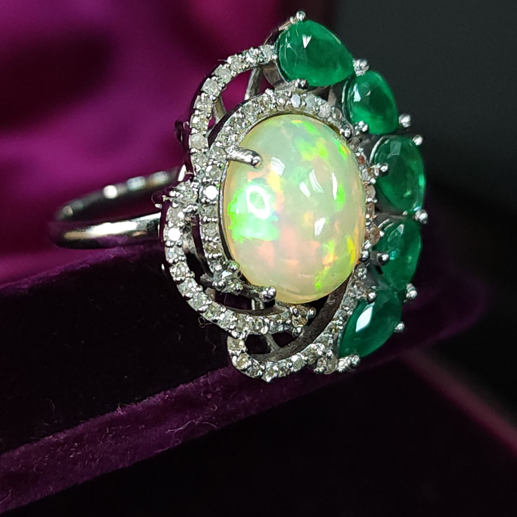 Genuine Opal, Genuine Emerald, and Earth-Mined Diamond Ring.& nbsp; A halo of 1.23 carats natural round, faceted, diamonds sweeps around the 3.40 carat oval, prong-set opal that is aglow with fire, as it is nestled into a 2.10 carat arch of prong-set, genuine pear-cut emeralds in this black rhodium-coated sterling silver ring.& nbsp; The ring is US size& nbsp;7.5 and has an approximate 1.8 mm shank& nbsp; and ribbed side gallery.& nbsp; This is a brand new item in excellent condition.