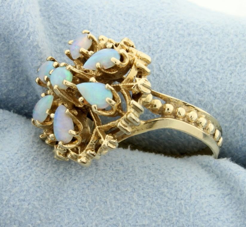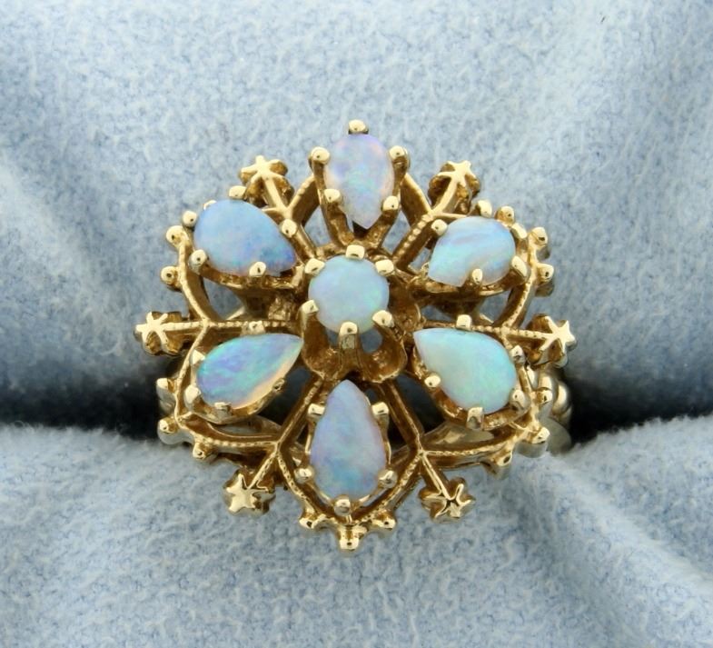 In 14K yellow gold this ring contains one 3.5mm round and six 5mm pear shaped opals with great color of play! Size 6 1/2 5.6g