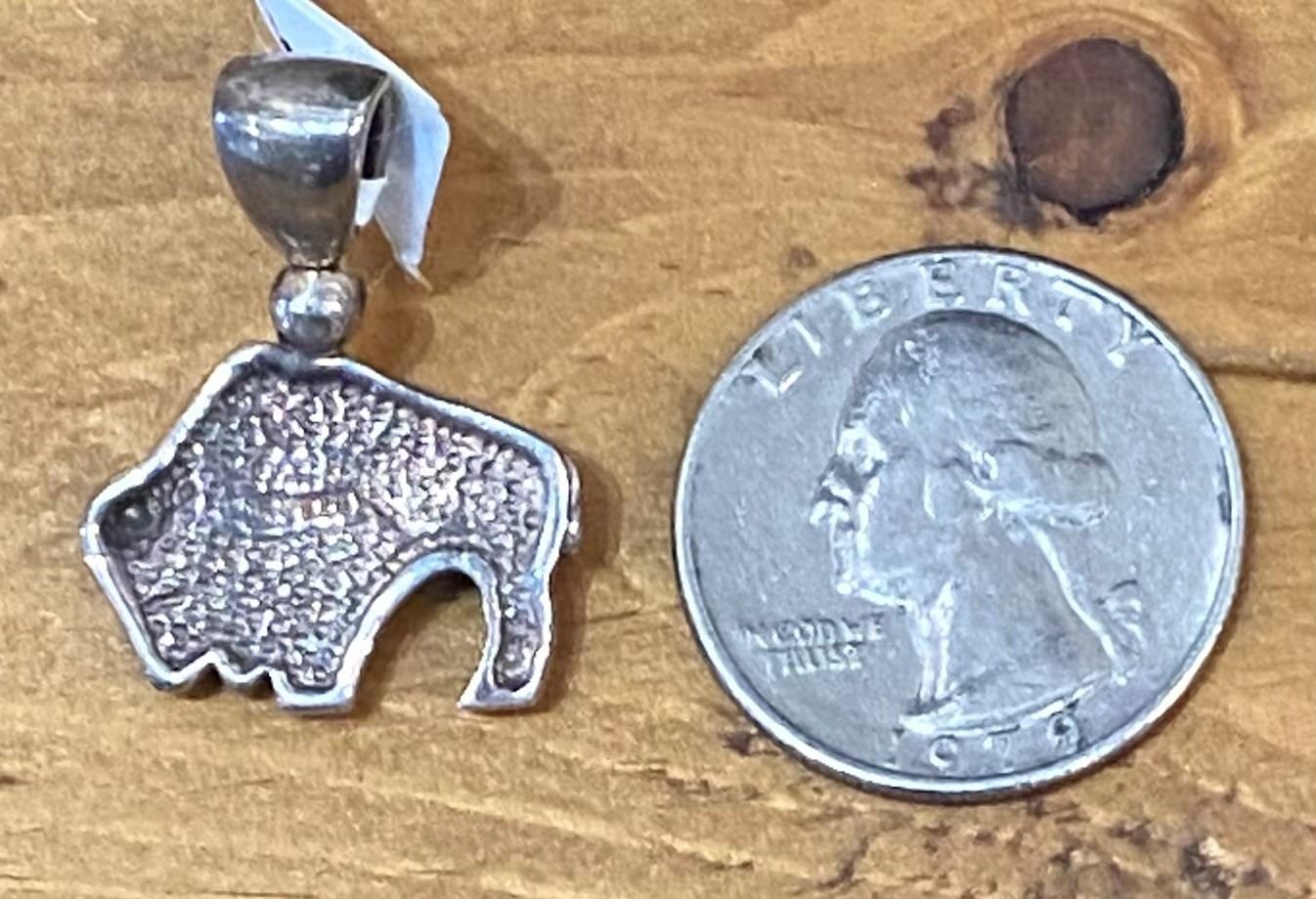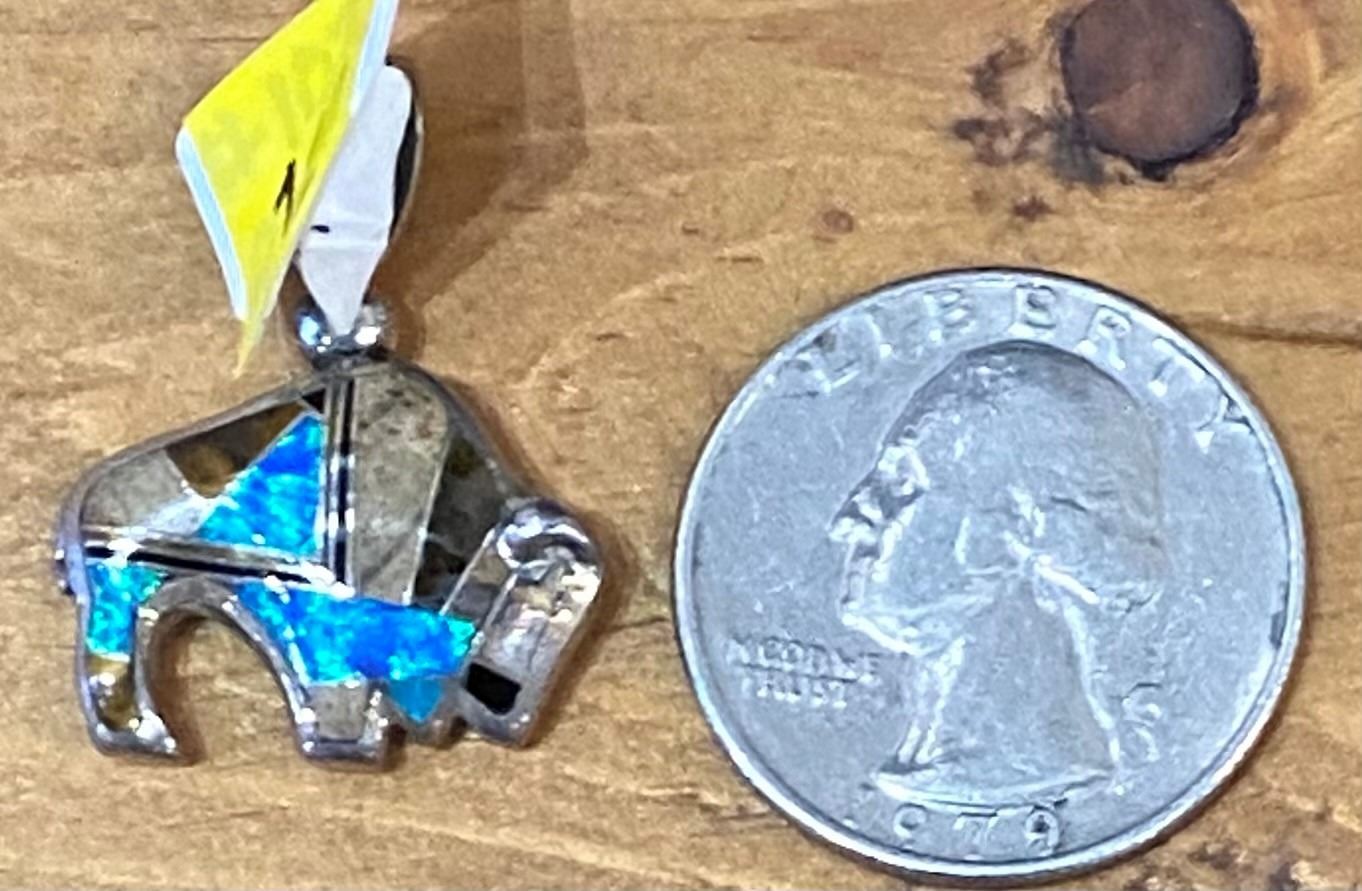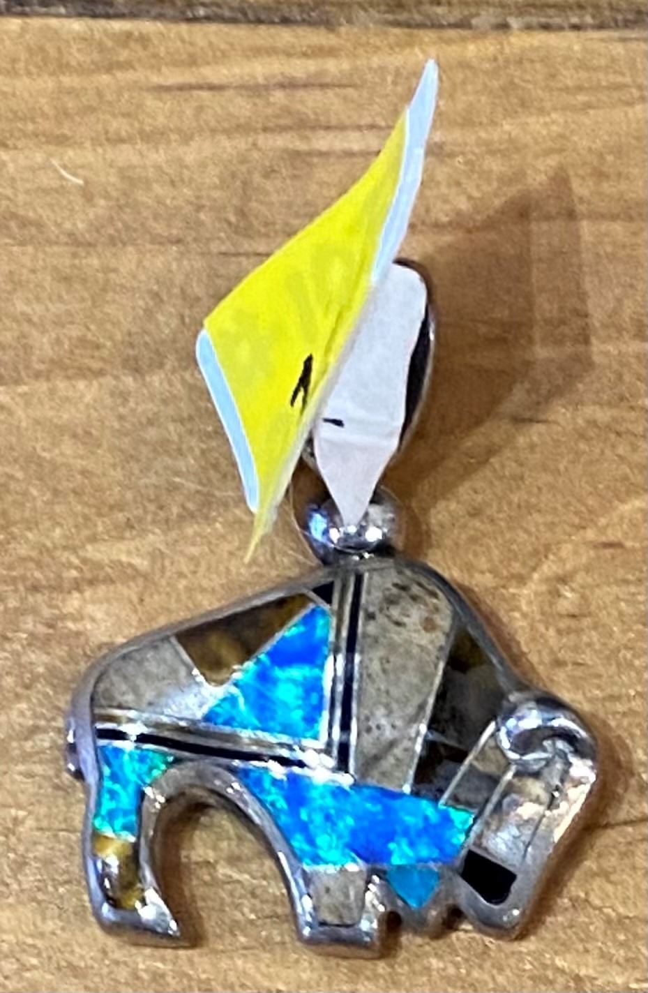 Opal, Tiger Eye and Jasper inlay buffalo pendant on sterling silver. Awesome inlay work by Albuquerque Jewelry Designer GL Miller 5/8 inch Wide by 1 inch with bale 6 grams