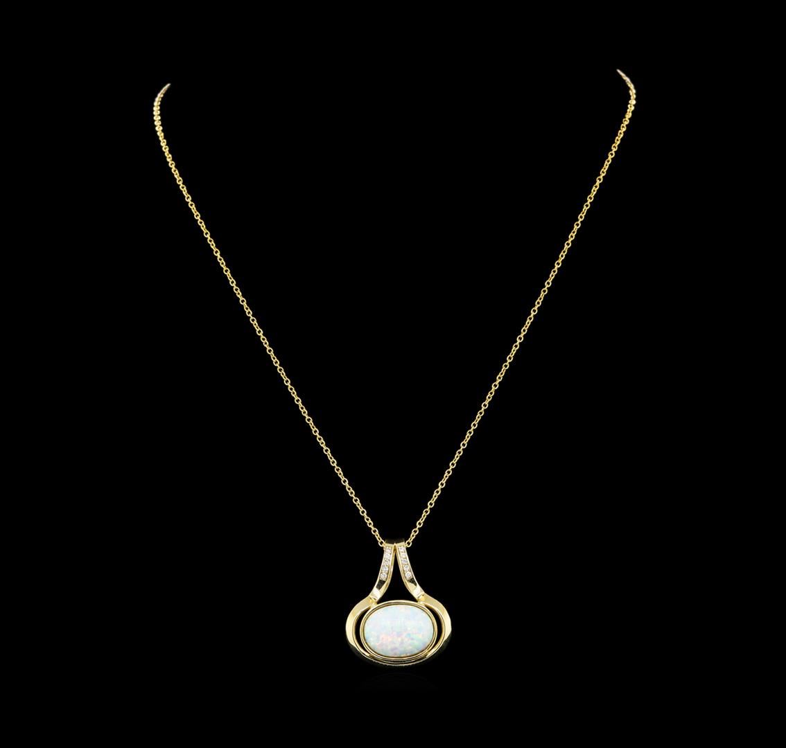 One pendant with chain featuring: 14KT yellow gold weighing 6.70 grams containing one man made opal center stone and ten pave set round diamonds with a total weight of 0.10ct.