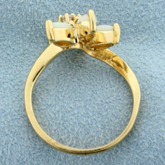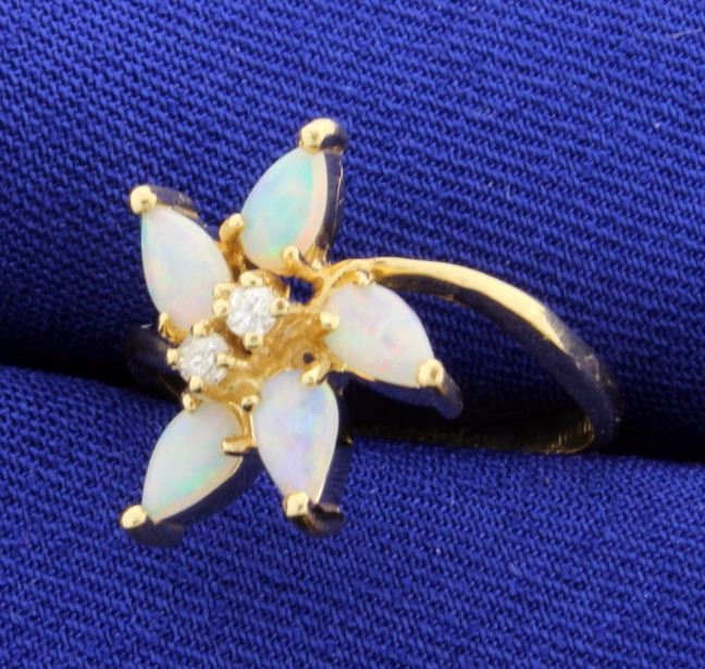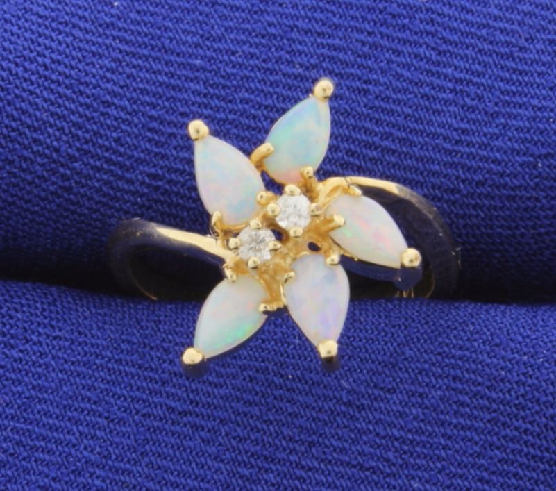 In 14k yellow gold this ring contains 5 5x3mm pear shaped opal gemstones with excellent play of color. .04ct total weight of diamonds. Size 5 3/4 3.3g