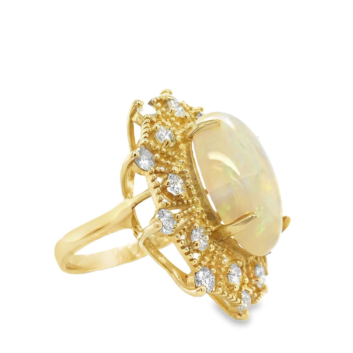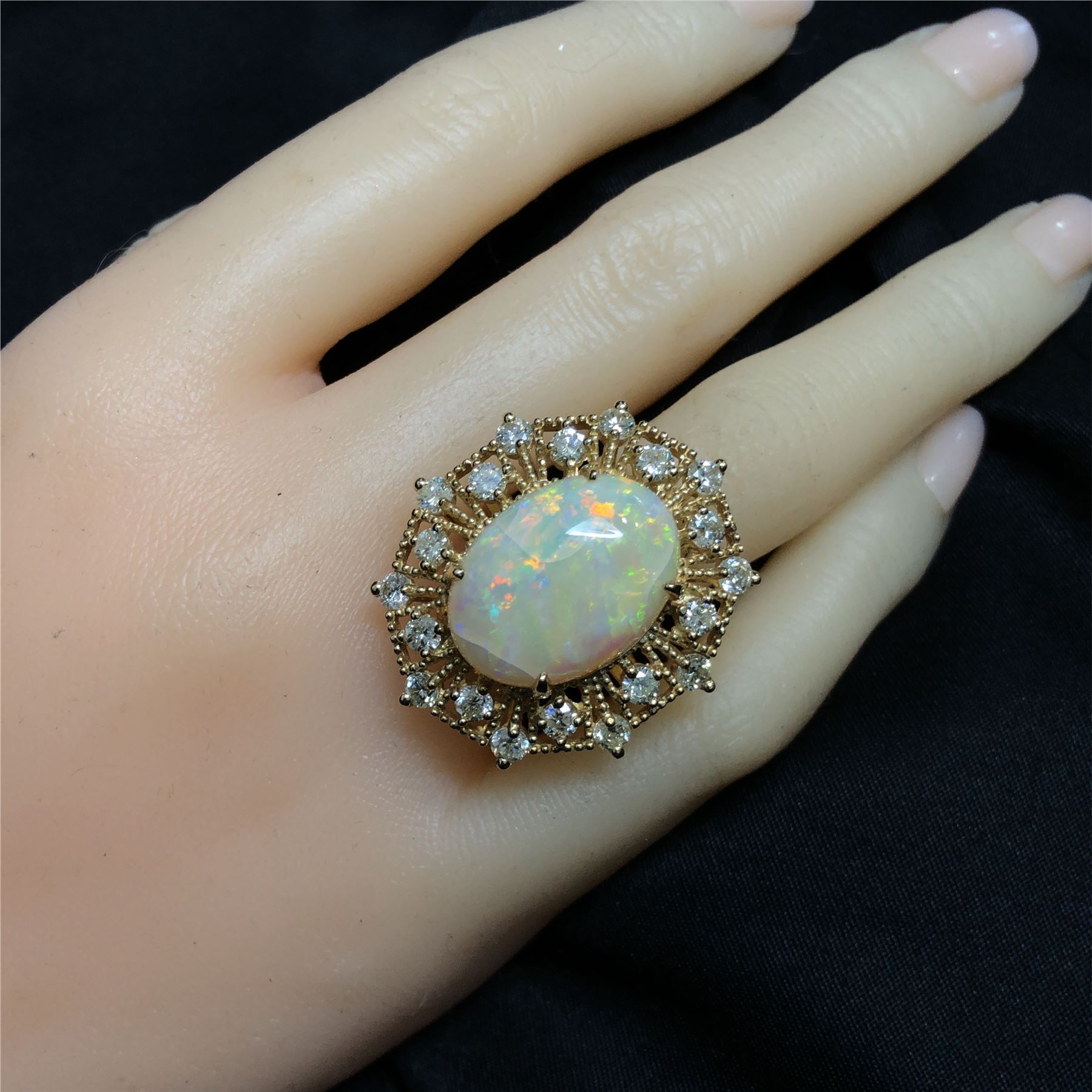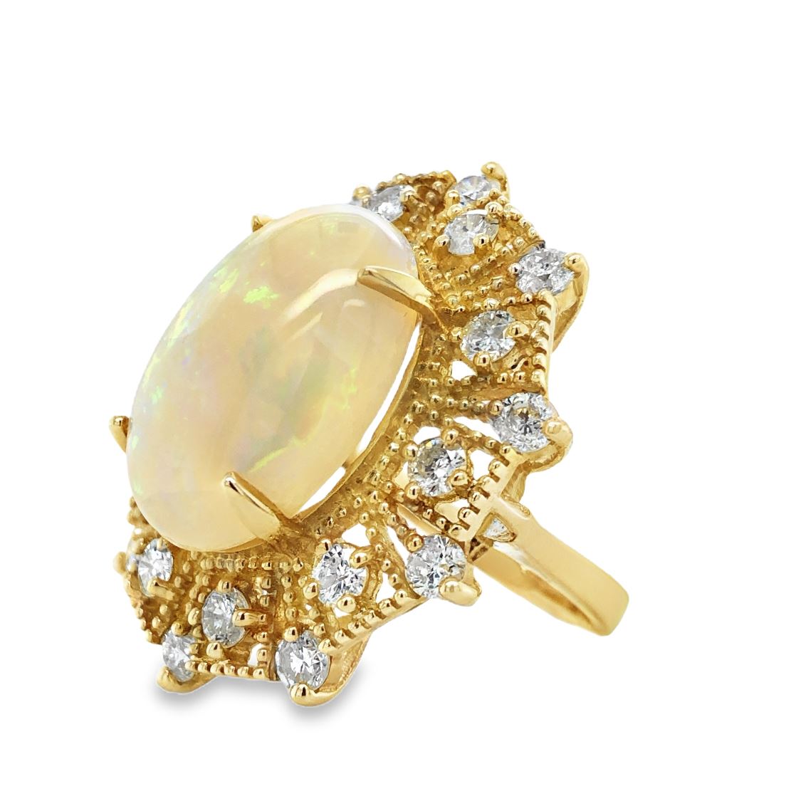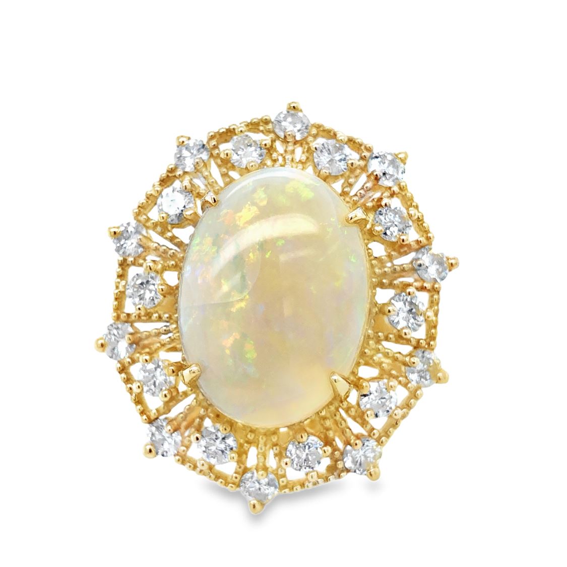 DESCRIPTION DETAIL: A bold ring featuring a 10.71 Carat Opal surrounded by a sunburst halo of round brilliant cut natural Diamonds in milgrained 14K Yellow Gold.