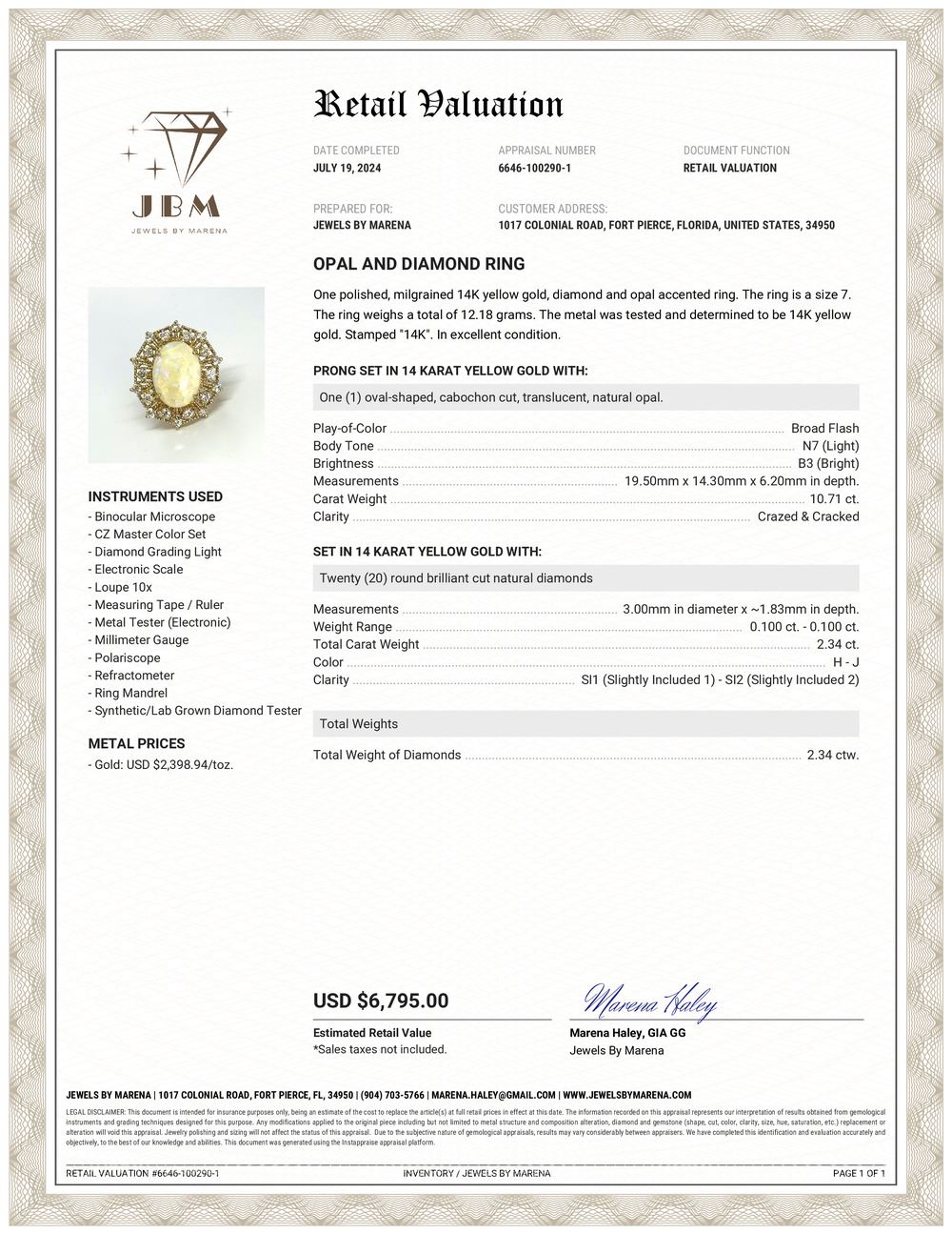 APPRAISAL REPORT: This piece is certified and appraised for $6,795.00 estimated retail replacement value by JBM.