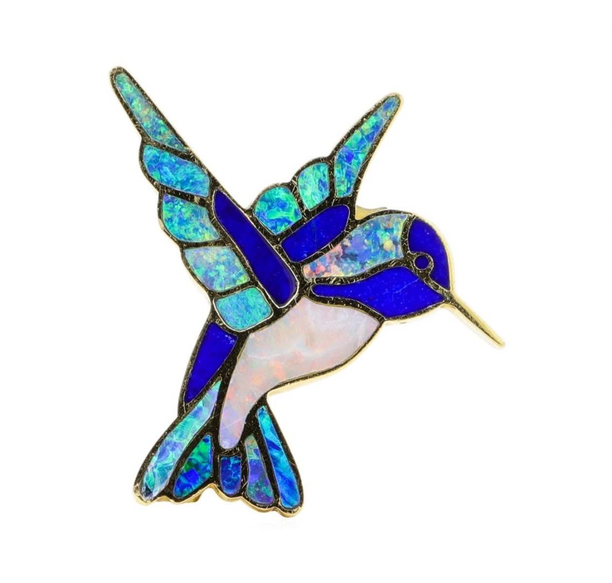 One hummingbird pin/pendant featuring: 18KT yellow gold weighing 7.4 grams containing inlaid pieces of opal and lapis lazuli.