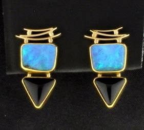 In 14k yellow gold each earring contains a 10x8mm opal gemstone with great play of color and a 8mm onyx gemstone. They are 1inch long with safety backs.     8.4g