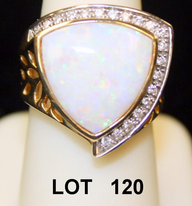 Opal and diamond ring, set in 14kt yellow gold. Dealer’s tag still attached. Retail: $2,475. Good quality Australian opal. Est: $400 - $800