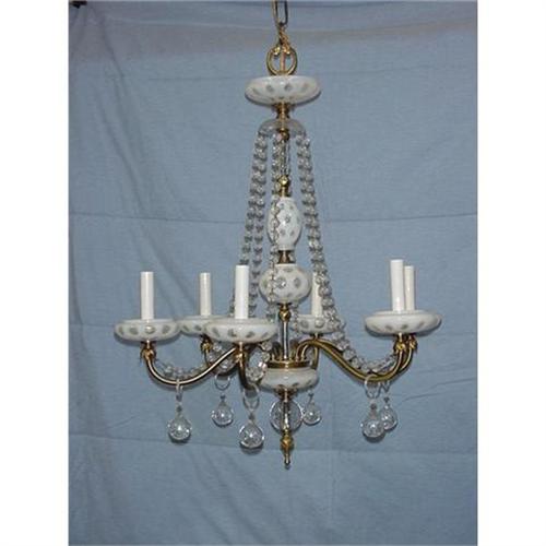 A very pretty mid 20th century chandelier, 27" tall, 21 1/2" wide, with six lights. There are 6 - 18" long glass bead chains with 1/2" dia. glass beads, 6 - 1 1/4" diameter glass balls hang from each arm and a 2" diameter glass ball at the bottom. The chandelier has brass arms and is fitted with opalescent glass cups with thumbprint to clear design, this design is repeated on the body of the chandelier. There is several feet of chain and wire, which appears to be in good condition and should work without rewiring. There is however no ceiling canopy but one can be easily obtained. The light is in very good condition and a cleaning will make the chandelier sparkle and add just the right touch to any interior.