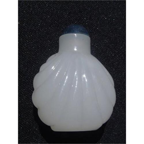 Opalescent white Peking glass snuff bottle with a scallop design. A blue color Peking glass stopper complements this exquisite pate du verre art glass snuff bottle. Height: 2.8" (7 cm.). Estimated retail value: $650.