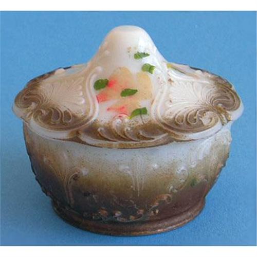 <tr><td>Title:Opaline Milk Glass Floral Decorated Powder Jar</td></tr>