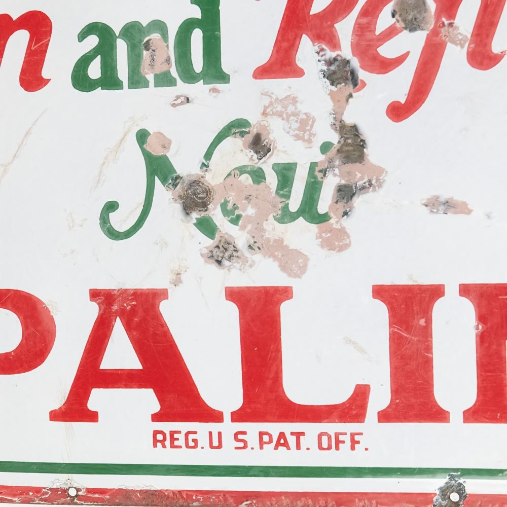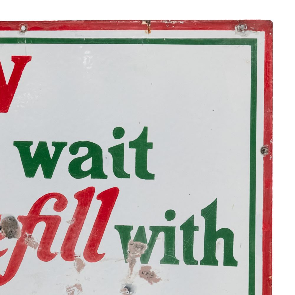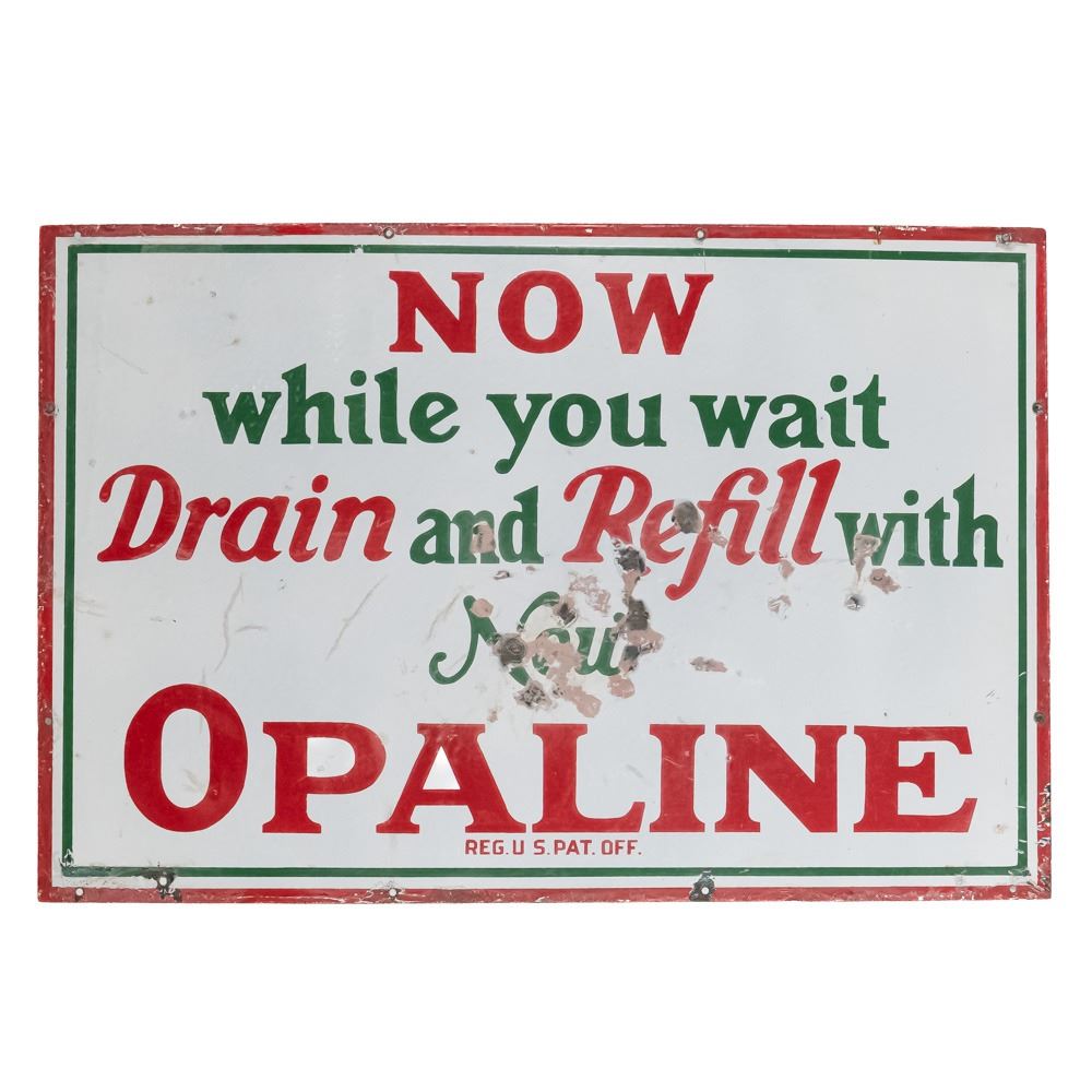 "Now while you wait Drain & Refill with Opaline" Sinclair Gas Station single sided porcelain advertising sign. Good overall condition with discoloration, stray marks and some chipped porcelain. Approximately 24"t x 36"l. Please use photos to judge condition and bid accordingly.