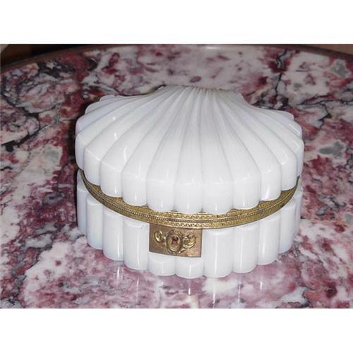 A beautiful regency period French white opaline box in the shape of a large sea shell, 6 1/2" wide, 5 1/2" long and 3 1/2" tall. Beautifully hand cut with gilt metal band with greek key design and lock. The box is exquisite, the size and shape are truly eye catching. The box weighs 4 1/2 Lbs. The box is locked shut and a key must be found to open it. The condition is beautiful, there are several minor chips, but overall the box is in beautiful condition.