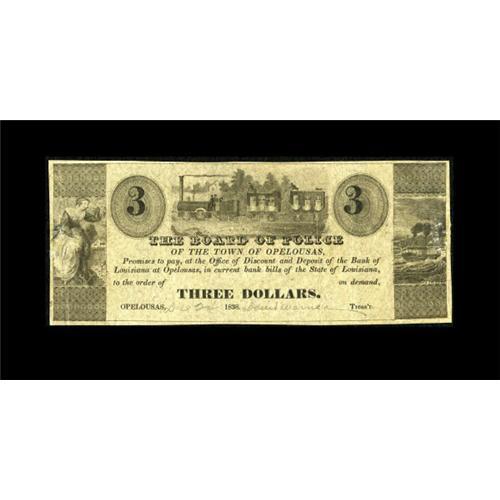<B>Opelousas, LA- Board of Police of the Town of Opelousas</B></I> $3 Dec. 24, 1838<BR> The last of this scarce series. <B>About Uncirculated,</B></I> falsely filled in. <BR><I>From The Collection of a Louisiana Gentleman.</B></I><BR><BR><b>Shipping:</b> Coins & Currency (<a target="_blank" href="http://www.heritageauctions.com/common/shipping.php">view shipping information</a>)