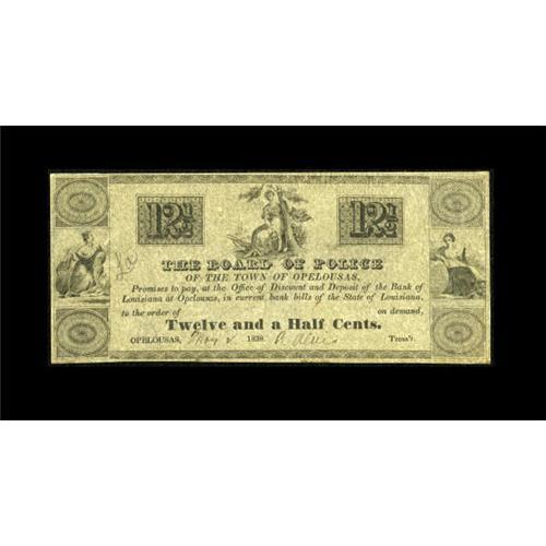 <B>Opelousas, LA- Board of Police of the Town of Opelousas</B></I> 12 1/2¢ Nov. 2, 1838<BR> The first of four high grade examples from this issue. All are likely falsely dated and signed, a fact omitted by the cataloguers when this piece was sold in the Rareshide offering of June, 2005. <B>Uncirculated, </B></I>with a light pencil notation "La."<BR><I>From The Collection of a Louisiana Gentleman.</B></I><BR><BR><b>Shipping:</b> Coins & Currency (<a target="_blank" href="http://www.heritageauctions.com/common/shipping.php">view shipping information</a>)
