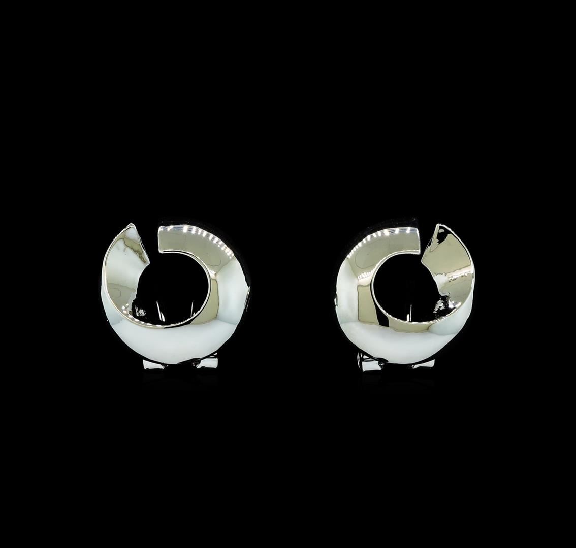 High end designer jewelry. Open Circle Design Earrings - Rhodium Plated. Rhodium Plated French Clip. Silver. 1inch.