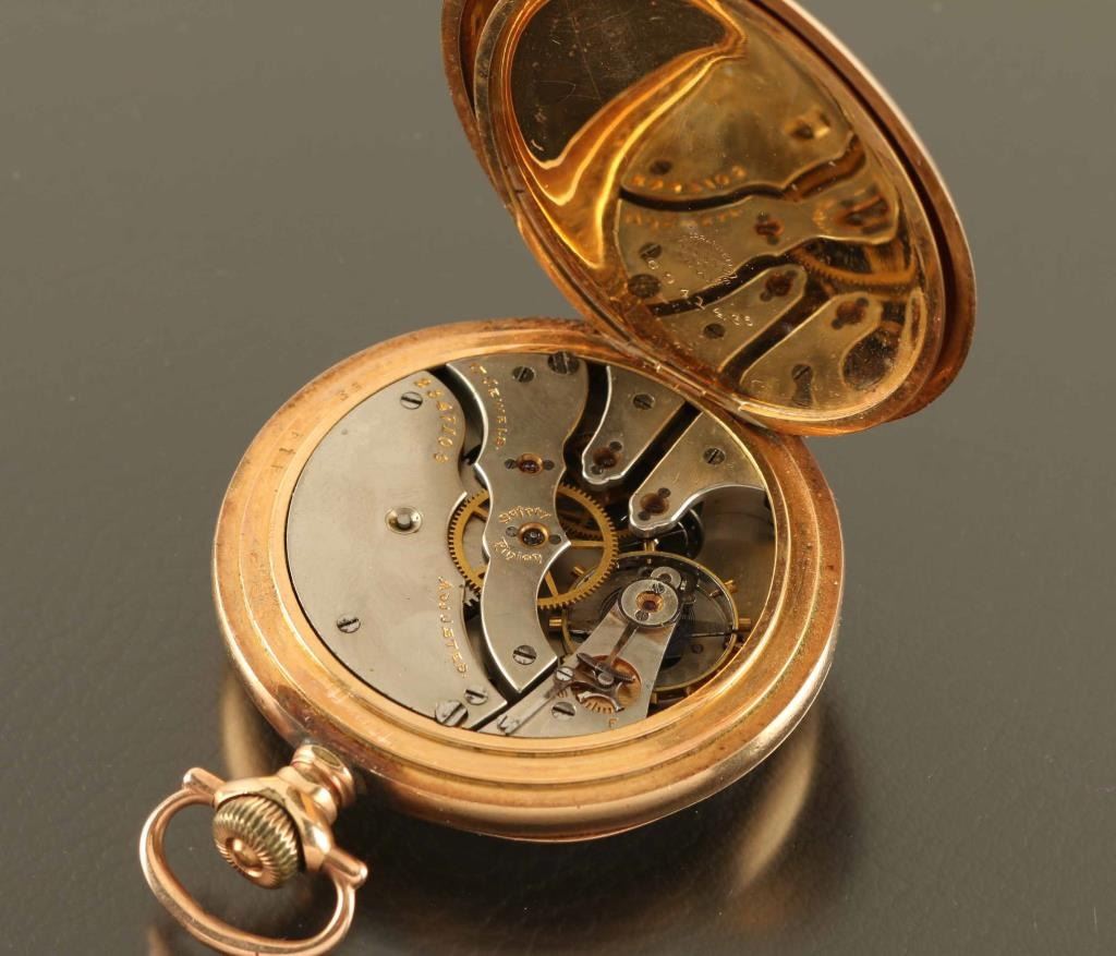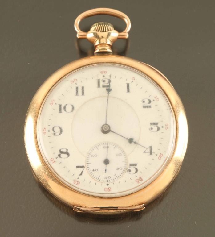 Rolled yellow gold with engraved monogram "GB". Case is marked "Duber Special" with a serial number 6941435 69436 17 jewel with built in stop watch and white enamel face. Non-working condition.