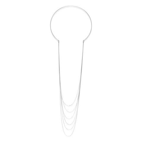 Rhodium plated sterling silver open flex collar with 6 long graduated chain strands connected from each open end of collar. The shortest chain strand measures 18" and the longest measures 25". The flexible collar measures approximately 2mm thick.