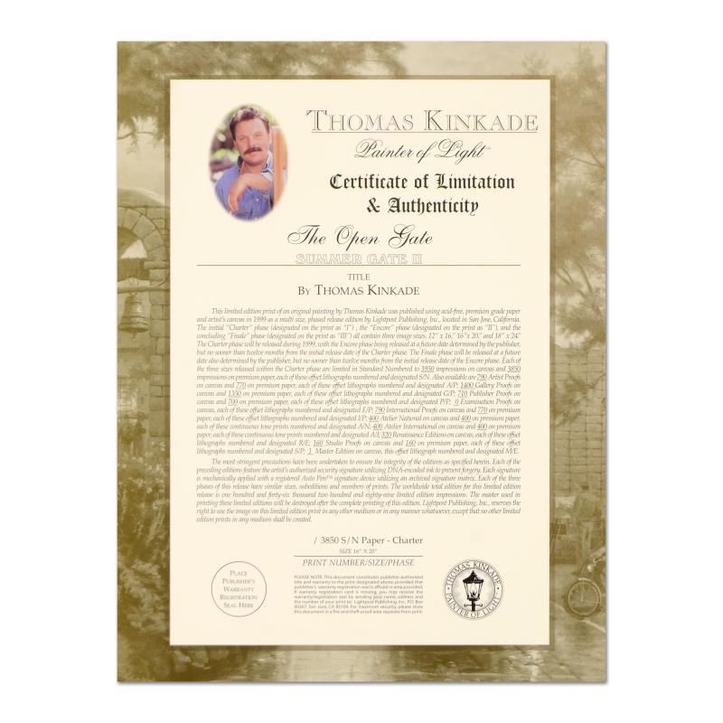 "Open Gate" is an offset lithograph on paper by Thomas Kinkade (1958-2012), numbered and hand signed by the artist. Includes Certificate of Authenticity from Lighthouse Publishing. Measures approx. 20" x 16" (border), 16" x 12" (image).
