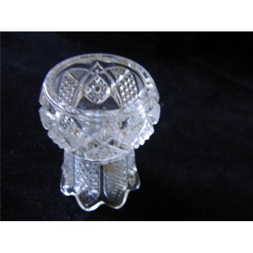 This unsual item was featured in 1001 Open Salts, 1996, #3730, described as "scarce." The pattern is just like the Massachusetts State pattern by US Glass (1898-1910). The open salt can be turned upside down to function as a toothpick holder or match holder. At the bottom of the toothpick holder, the name Jos. Kuhn & Son can be read; it is embossed backwards on the bottom of the salt cellar end. It is in mint condition.