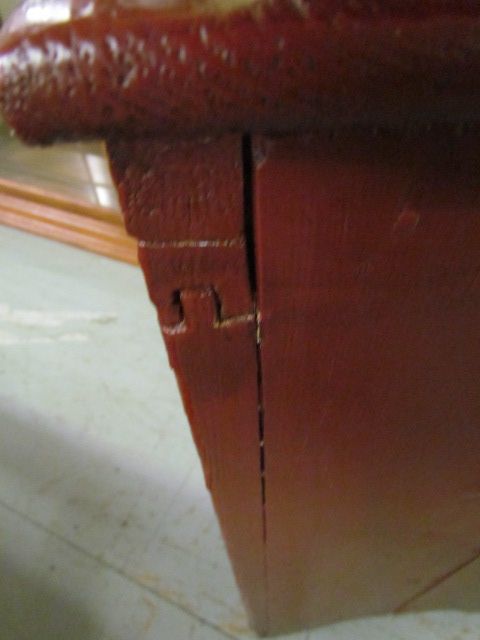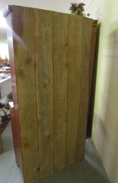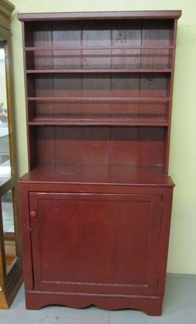 19th Century Open Stepback Cupboard, well formed bracket feet, single large base Door in red old paint, original board back, top with plate guardrail 74" x 37" x 17"