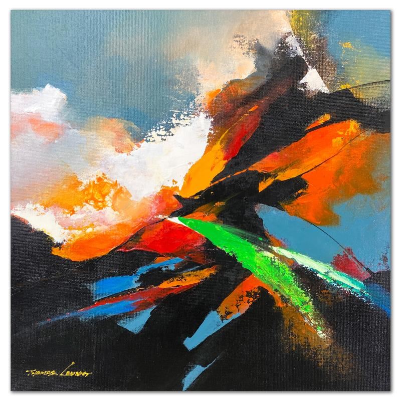 "Open Valley 1" is an original acrylic painting on canvas board by Thomas Leung, hand signed by the artist. Includes Letter of Authenticity. Measures approx. 16" x 16" (image).