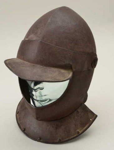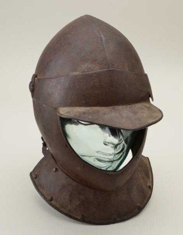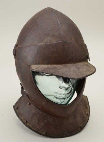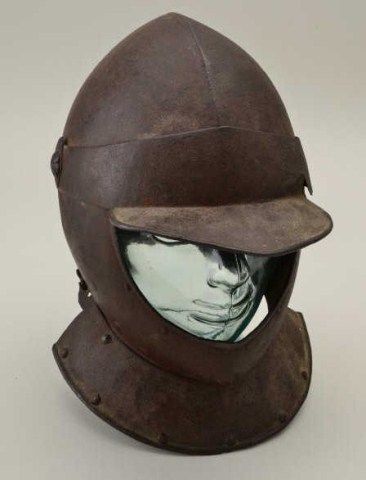 Open face cavalry man’s helmet circa early 17th century possibly English. The helmet is missing the rear neck plate or guard but is otherwise complete and original. Made in two (2) pieces of lighter weight and showing arusty patina needing cleaning. Type that may have come to America in Colonial era. Est.; $1,500-$3,000