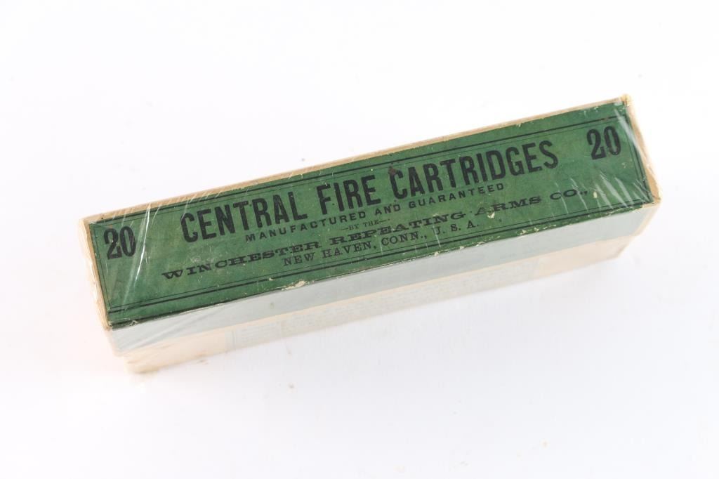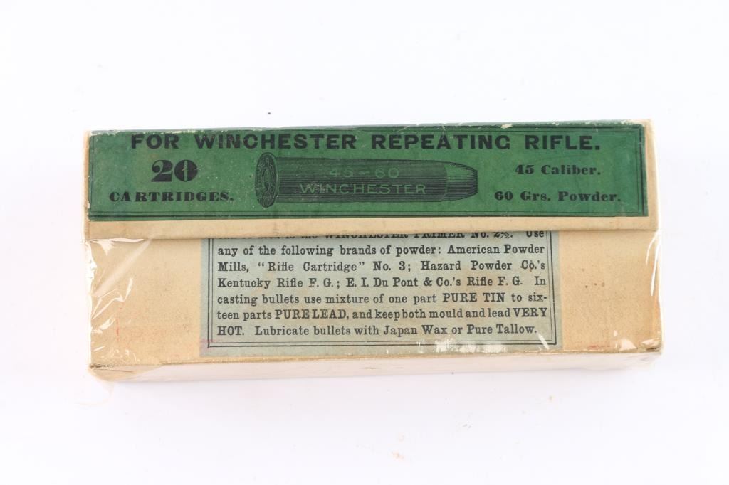 Manufactured by Winchester marked 45-60 with red label, use only on rifles with 45-60 marked on cartridge block (Model 1876's). Pictures cartridge on side and no smokeless marking. 8 plus condition on 1-10 scale.