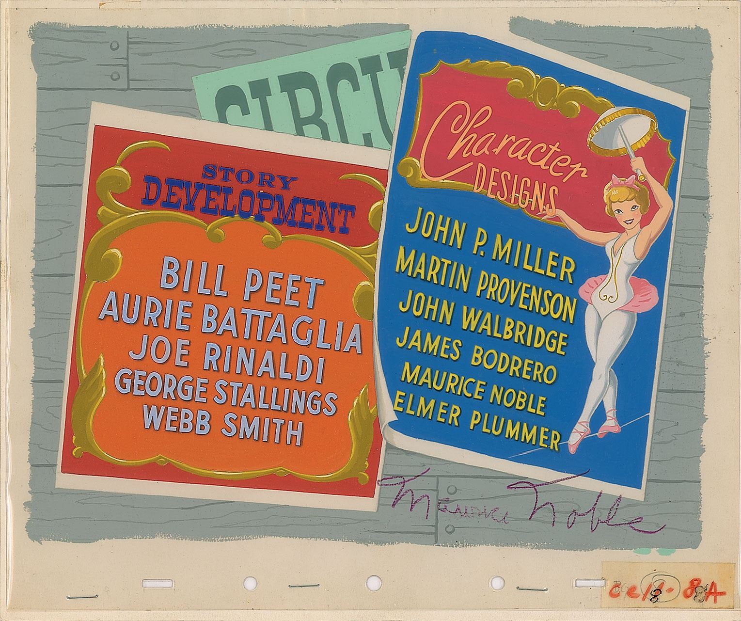 (Walt Disney Studios, 1941) Extremely rare original keymaster background set-up featuring the opening credit title card cels for "Story Development" and "Character Designs" from Dumbo. The cels are placed on a hand-painted keymaster production background. Image measures 11 x 8.5, with overall dimensions of 12 x 10. In fine condition. A unique and interesting piece.