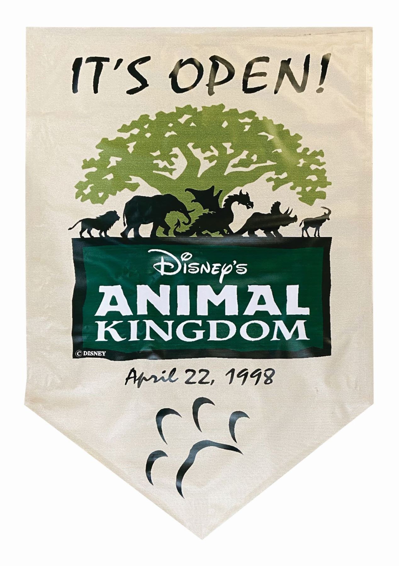 (Animal Kingdom, c.1998) An original opening day banner for the Animal Kingdom at Walt Disney World. Listing the opening date of April 22, 1998 below the park's logo, it measures 71.5"x47.5". The banner is composed of a durable canvas-like material for outdoor use and is in good used condition.