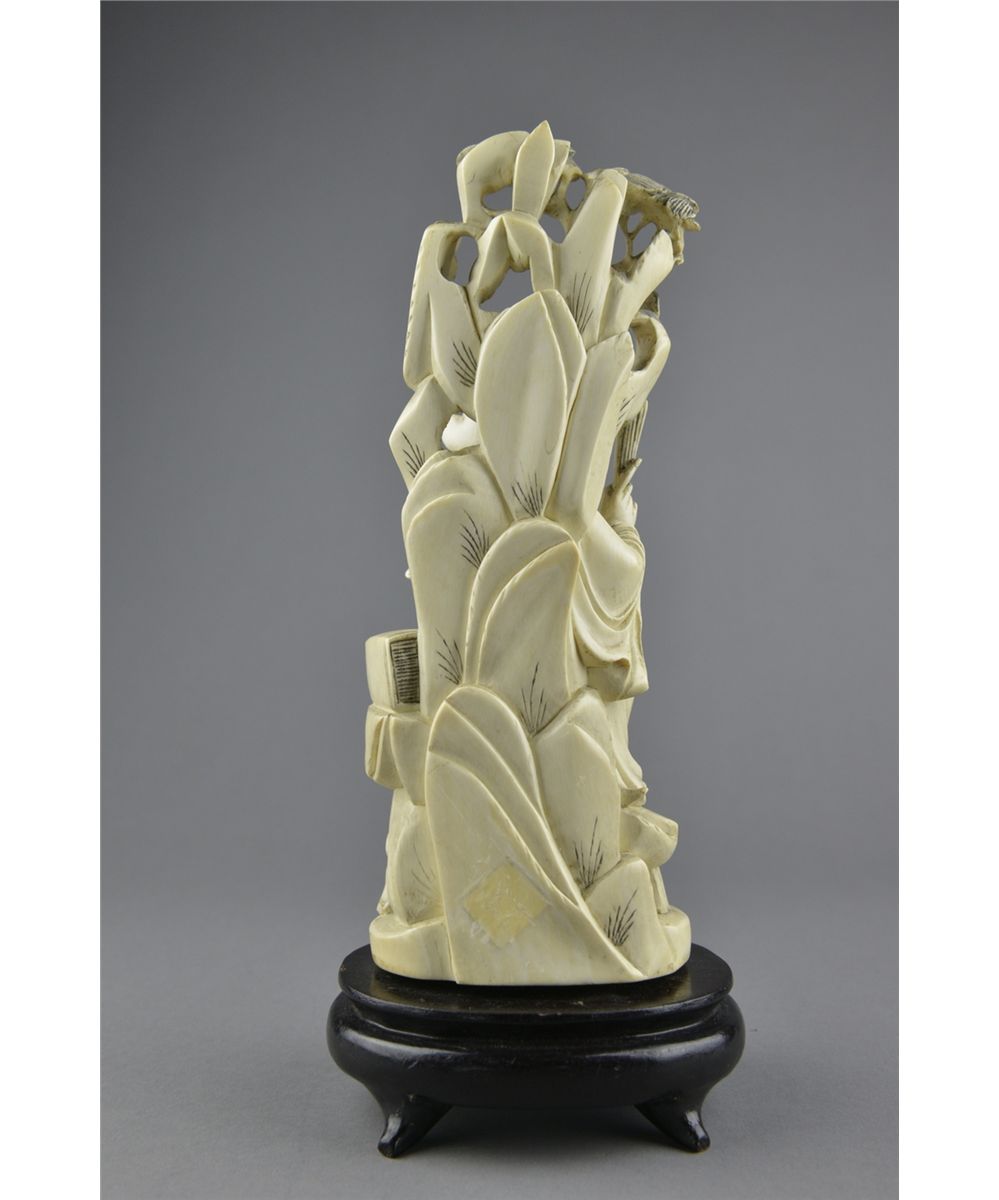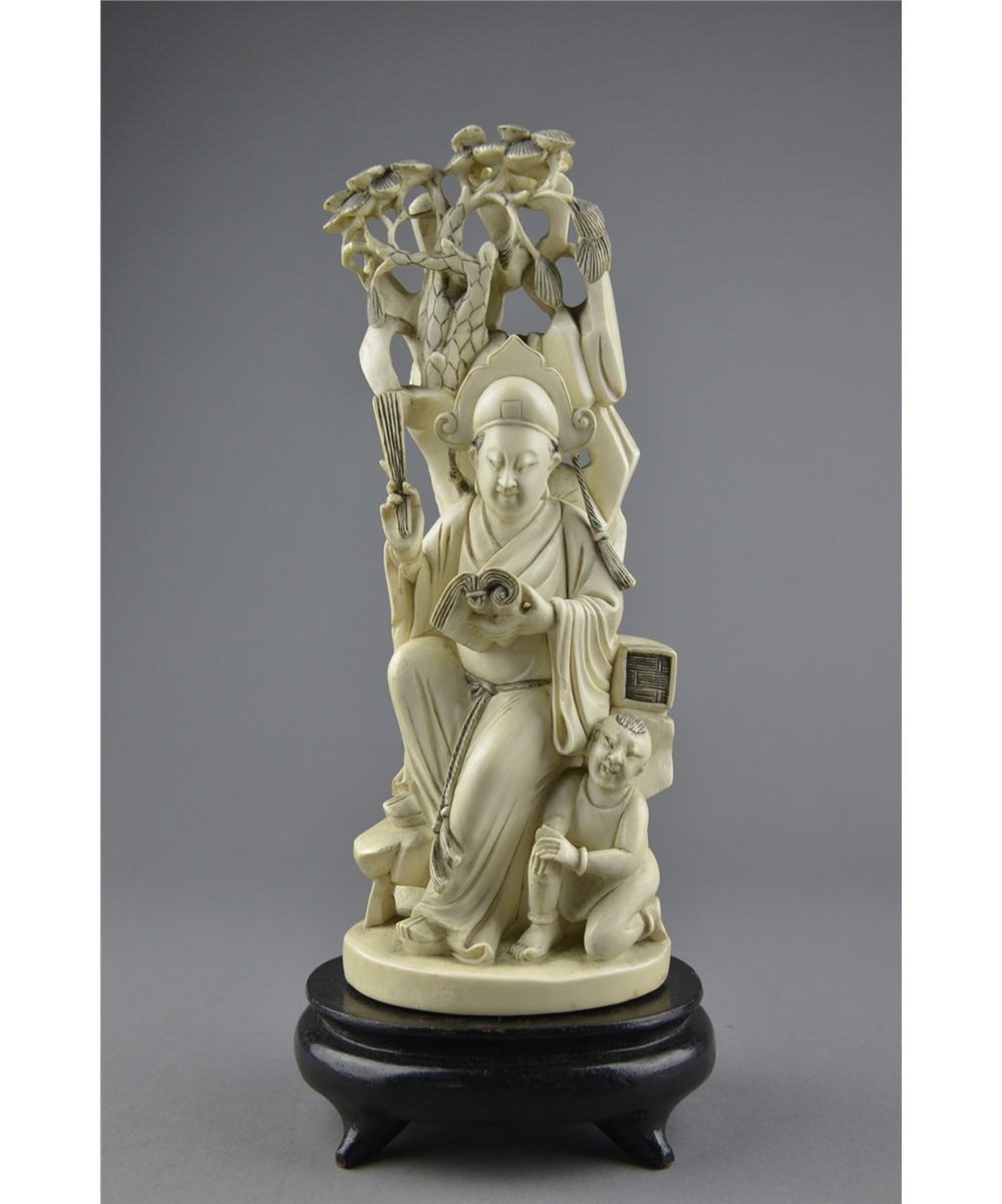 19th Century Chinese ivory carved figure; featuring seated scholar; seated with attendant reading a book; underneath overhead hanging tree in openwork relief; H: 29 cm, 1185 grams (with stand), wood stand; Provenance: Liao Collection Vancouver