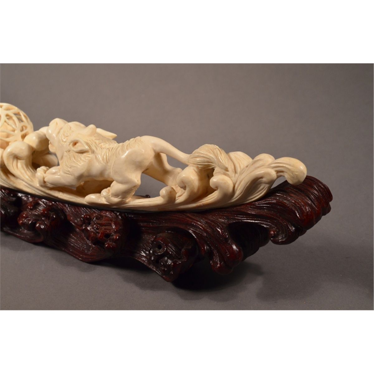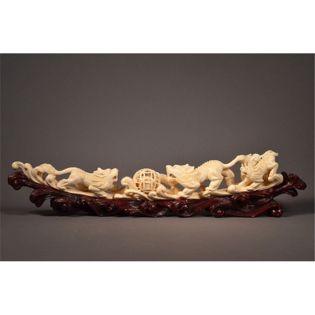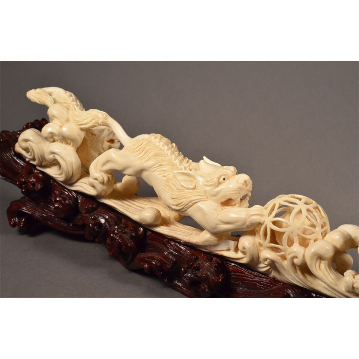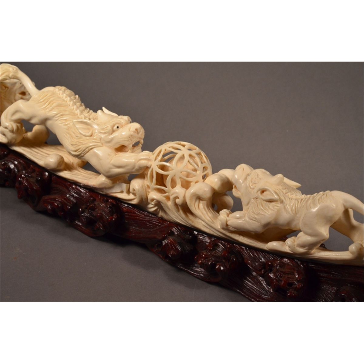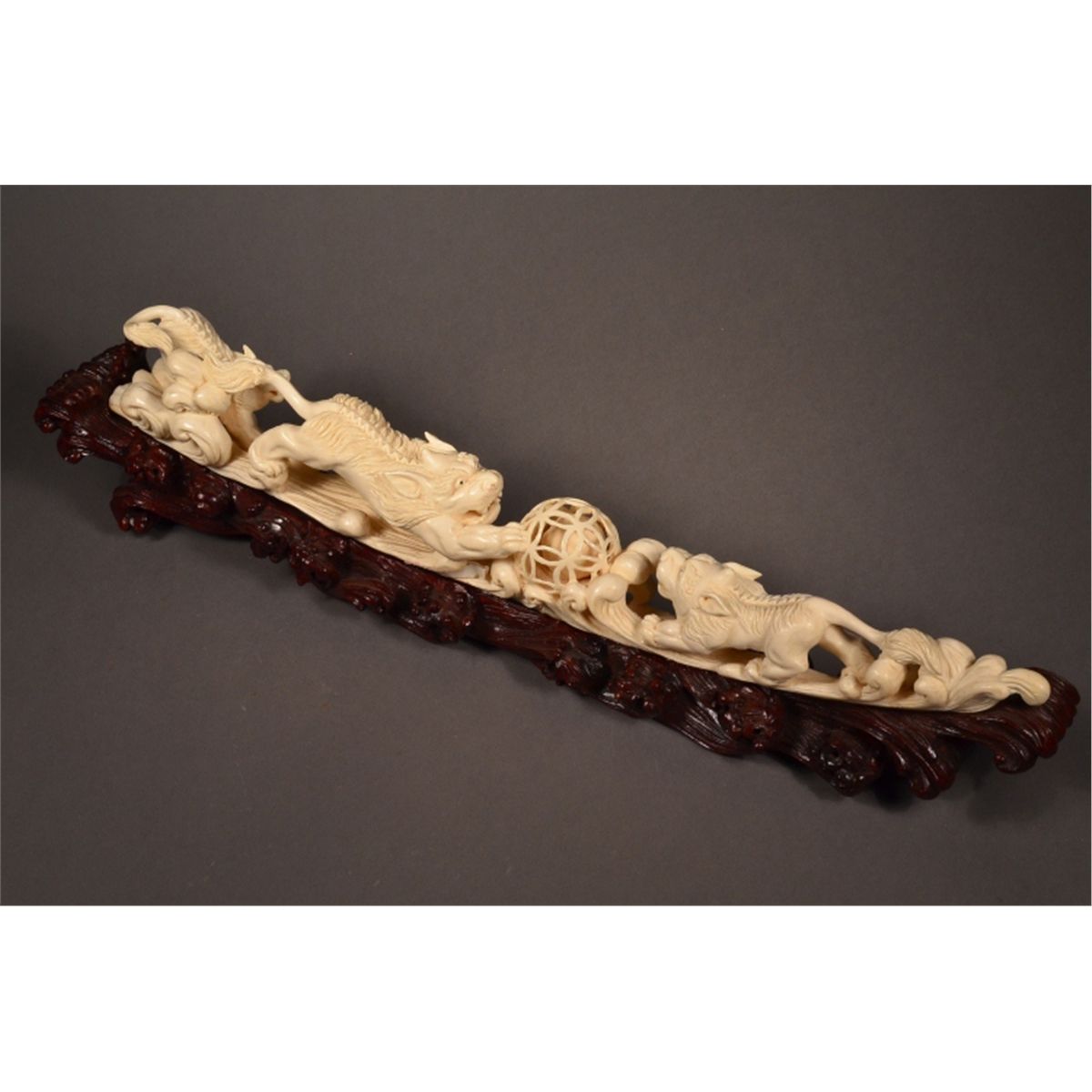 Finely carved, Chinese ivory tusk; fully openwork featuring three lions and puzzle ball with loose ball inside; 18" long, 3" tall, 2.5" wide, hand carved wood stand