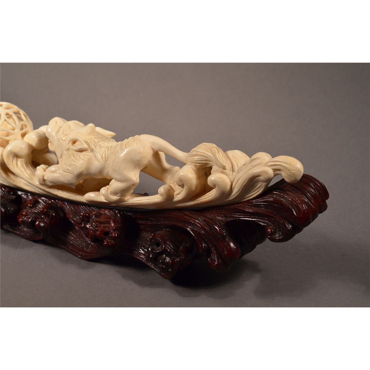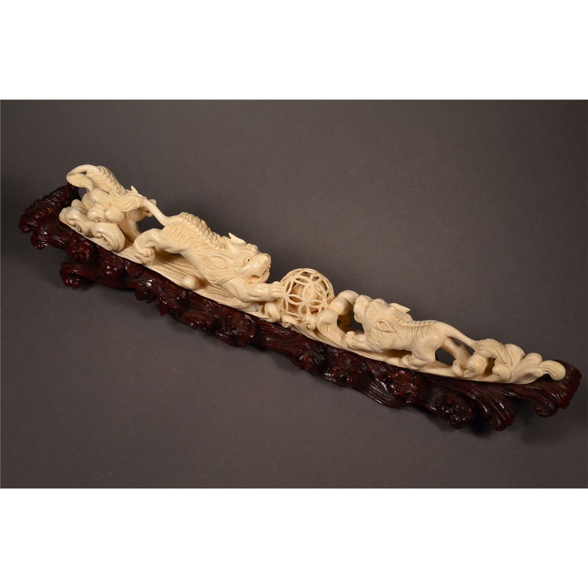 Finely carved, Chinese ivory tusk; fully openwork featuring three lions and puzzle ball with loose ball inside; L: 45.5 cm, H: 7.5 cm, W: 6.25 cm, hand carved wood stand