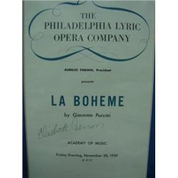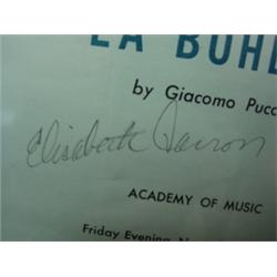 Autograph of Elizabeth Carron on Philadelphia Lyric Opera Program Nov. 20, 1959. Framed in 12" x 16" wood frame. Cast included: Giuseppe di Stefano, Ercole Bertulino, Nicholas Maxymuk & Mark Elyn among others. Very good condition.
