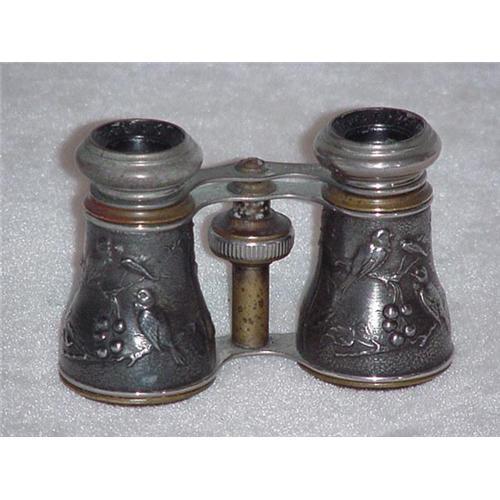 A pair of French opera glasses, early 20th century, 4" wide the eye piece reads "Sportiere, Paris". They are also marked made in France on the frame. The body of the glasses are a burnished silver or pewter with birds in relief. The focusing mechanism does work and the overall condition is very good, there are some dents to the surround on one of the lenses.
