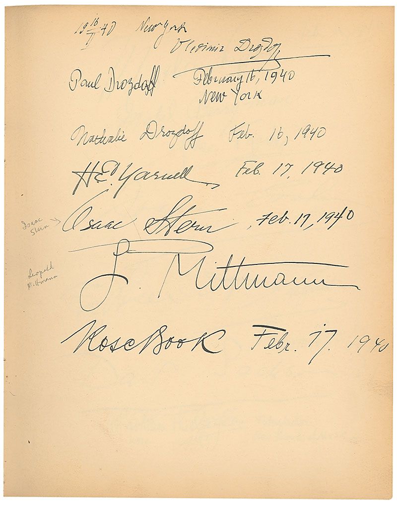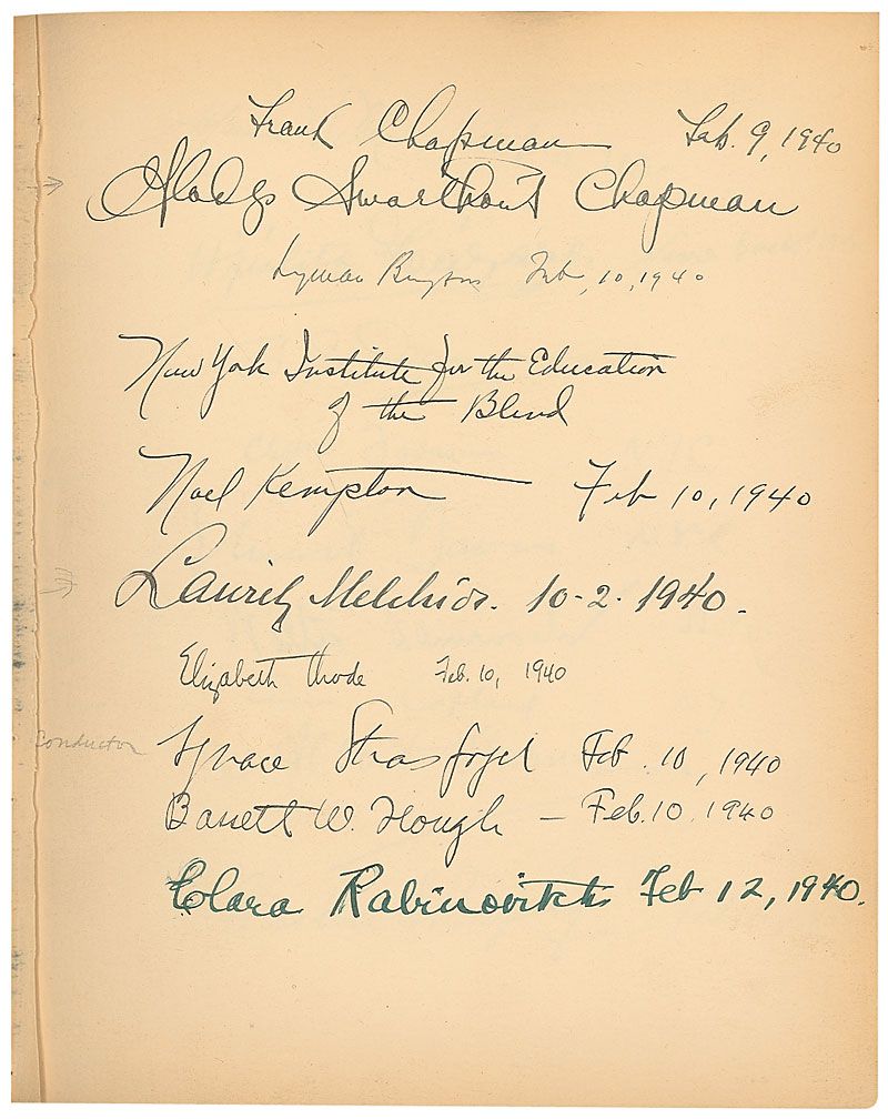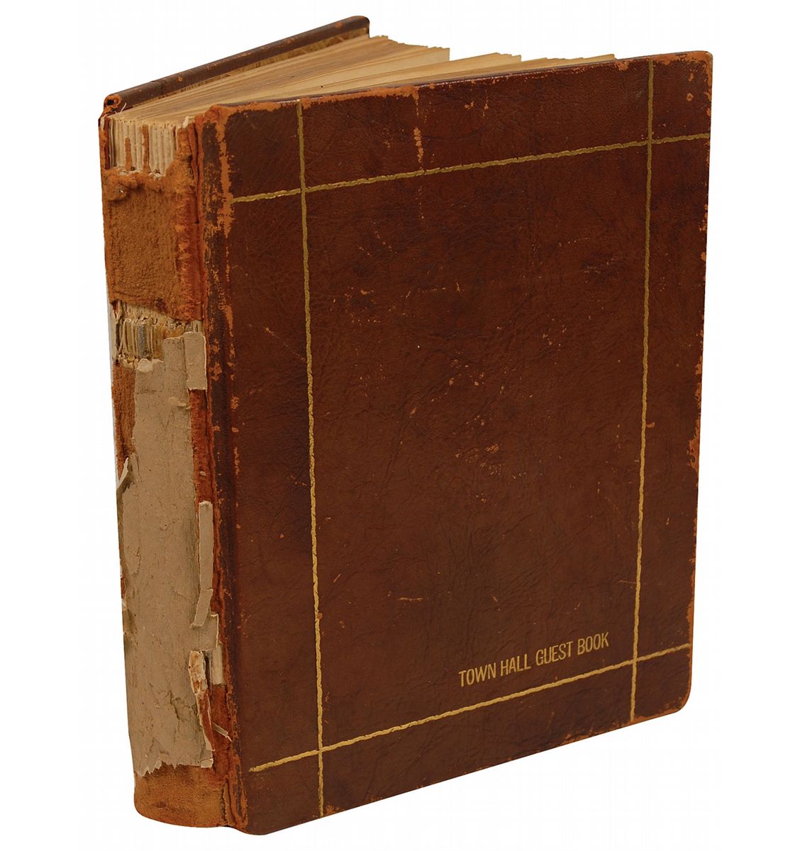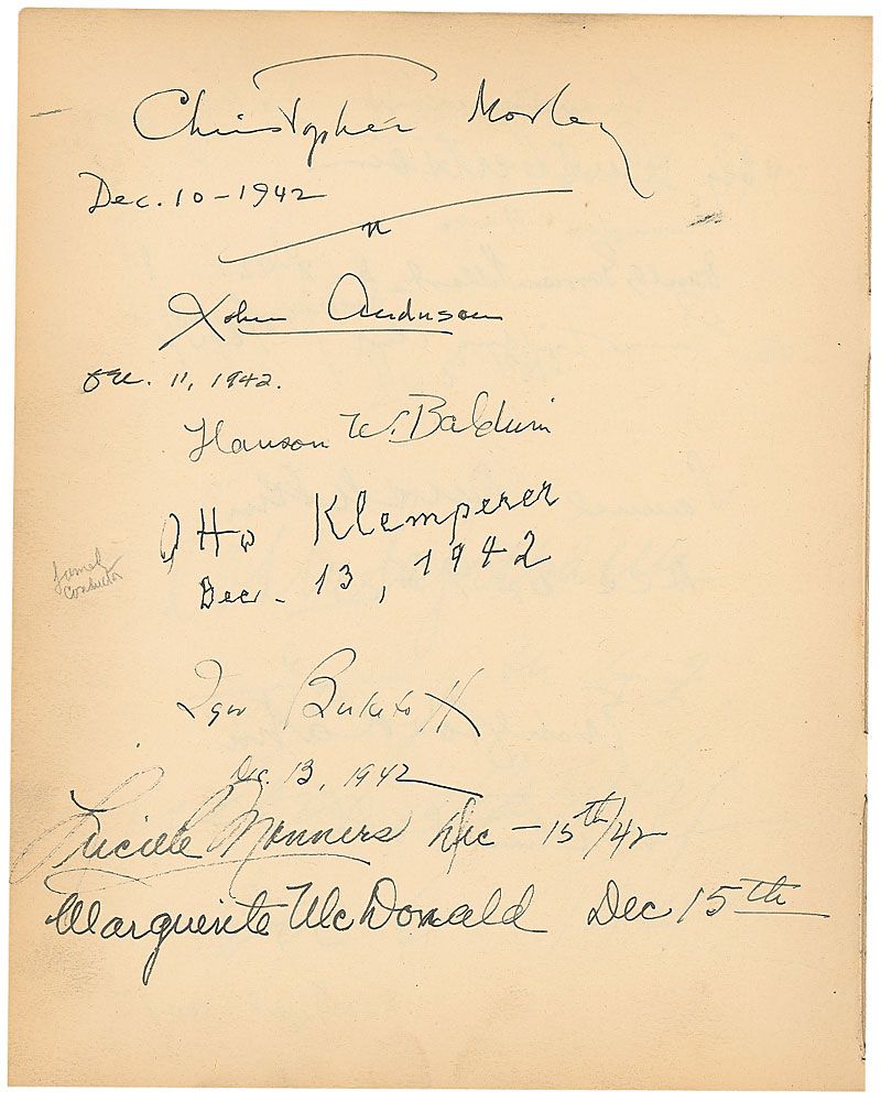 Hardcover guest book from an unknown town hall, 10 x 12, spanning the years of 1939–1945, signed inside by hundreds of guests, including authors, entertainers, composers, musicians, members of the military, and other notables. Signers include: H. G. Wells, Sinclair Lewis (2), the von Trapp Family, Arthur Balsam, Nelson Eddy, Egon Petri, Walter Damrosh, Aaron Copland, Virgil Thomson, Frank Buck, Bela Bartok, Elisabeth Schuman, Isabel Scionti, Walter Damerosch, Albert Spalding (violinist), Bertrand Russell, Moritz Rosenthal, Lauritz Melchior, Ernst Wolff, John Charles Thomas, Vladimir Padwa, Robert Goldsand, Martial Singher, Elissa Landi, Robert E. Sherwood, Gypsy Markoff, Olive Middleton, George Romney, Ruth Draper, Elaine Malbin, Giuseppe Bamboschek, Elsa Maxwell, Norman Vincent Peale, Herbert Graf, Narciso Figueroa, George Szell, Carlos Salzeda, Sir Thomas and Lady Beecham, Gregor Piatigorsky, Wanda Landowska, Elmer Davis, Louis Persinger, Edmund Kurtz, Erich Kahn, Jan Peerce, Anthony Tudor, Vladimir Heifetz, Channing Pollock, Roland Hayes, Marisa Regules, Alfred E. Smith, Jean Hersholt, Jose Iturbi, Earl Schenck, Quentin Reynolds, Latte Layman, Christopher Morley, Isidor Achron, H. H. Knickerbocker, Marjorie Lawrence, Alexander Brailowsky, Joseph Szigeti, Isaac Stern, Helen Traubel, Harry Hershfield, Otto Preminger, Arthur Loesser, George Gallup, Allan Roy Dafoe, Isaac Stern, Eleanor Roosevelt (2), Gertrude Ribla, Margaret Bourke White, Pearl S. Buck, Jacques Fray, Marco Rizo,Otto Klemperer, Leopold Mittmann, Mischa Elman, Frank Buck, Kerstin Thorborg, Enzio Pinza, George F. Eliot, Samuel Dushkin, and Igor Sikorsky. Missing portion of spine, binding loose, repaired on the inside pastedowns, some loose pages, and surface loss and chipping to covers, otherwise fine condition. A one-of-a-kind plethora of opera singers, composers, and musicians, with the enticing potential for some elusive finds.