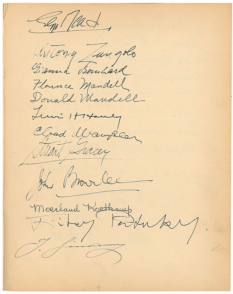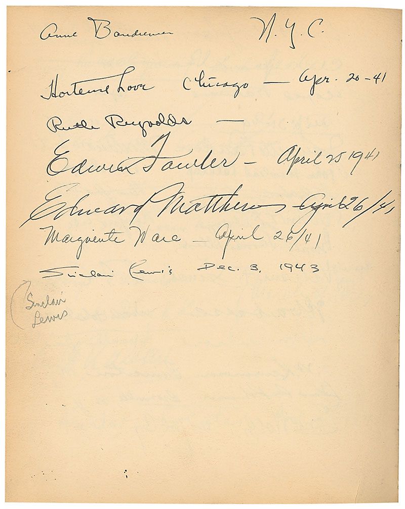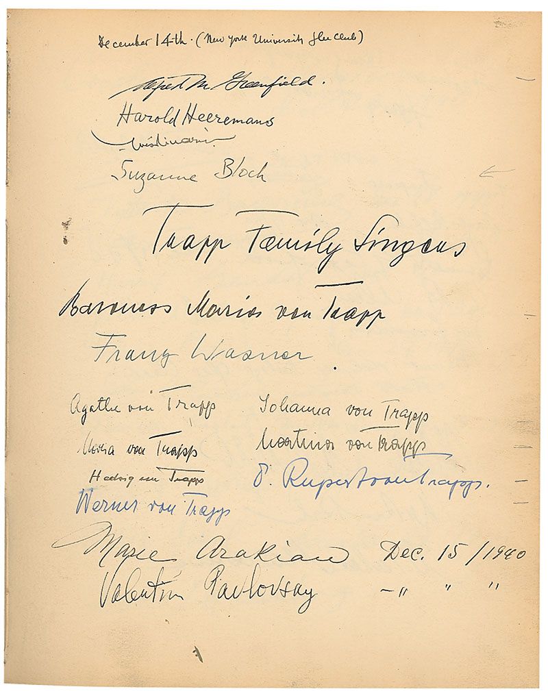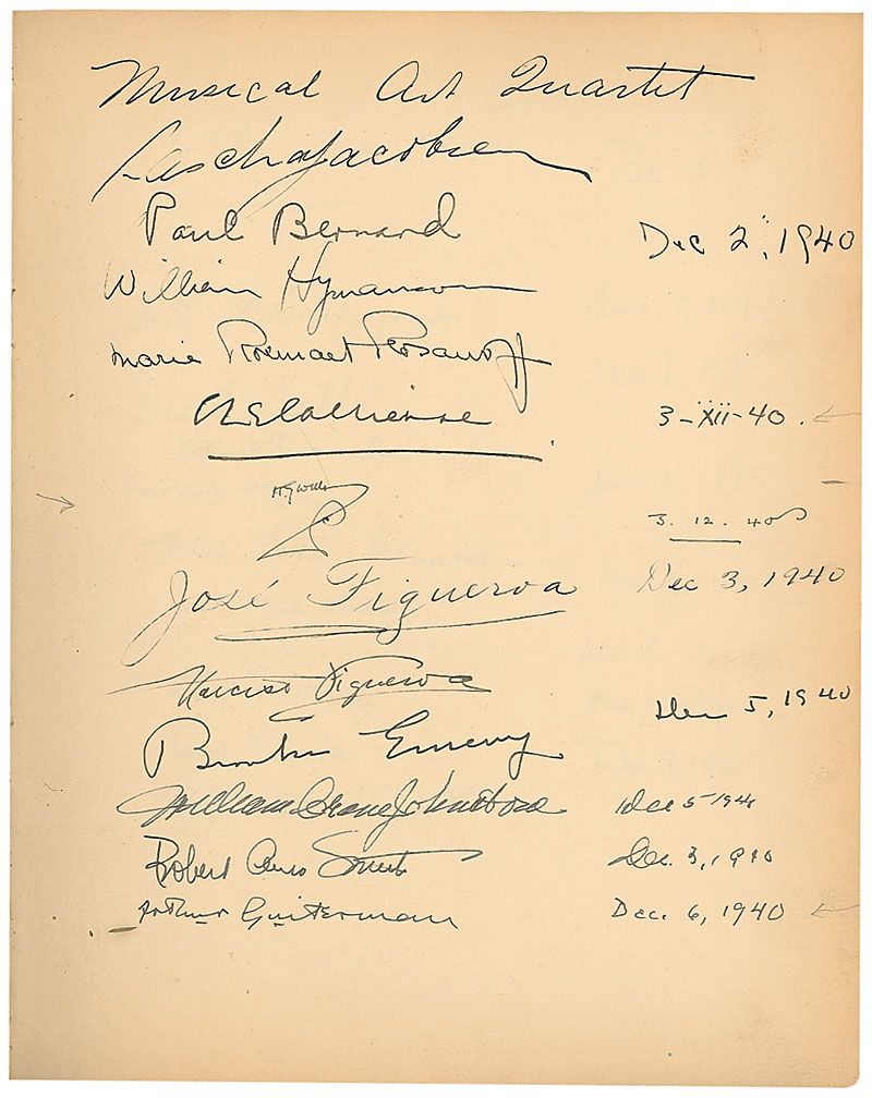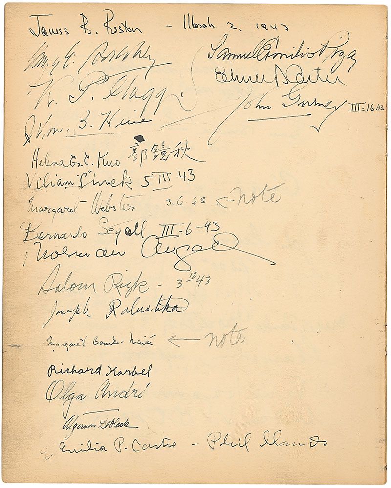 Hardcover guest book from an unknown town hall, 10 x 12, spanning the years of 1939–1945, signed inside by hundreds of guests, including authors, entertainers, composers, musicians, members of the military, and other notables. Signers include: H. G. Wells, Sinclair Lewis (2), the von Trapp Family, Arthur Balsam, Nelson Eddy, Egon Petri, Walter Damrosh, Aaron Copland, Virgil Thomson, Frank Buck, Bela Bartok, Elisabeth Schuman, Isabel Scionti, Walter Damerosch, Albert Spalding (violinist), Bertrand Russell, Moritz Rosenthal, Lauritz Melchior, Ernst Wolff, John Charles Thomas, Vladimir Padwa, Robert Goldsand, Martial Singher, Elissa Landi, Robert E. Sherwood, Gypsy Markoff, Olive Middleton, George Romney, Ruth Draper, Elaine Malbin, Giuseppe Bamboschek, Elsa Maxwell, Norman Vincent Peale, Herbert Graf, Narciso Figueroa, George Szell, Carlos Salzeda, Sir Thomas and Lady Beecham, Gregor Piatigorsky, Wanda Landowska, Elmer Davis, Louis Persinger, Edmund Kurtz, Erich Kahn, Jan Peerce, Anthony Tudor, Vladimir Heifetz, Channing Pollock, Roland Hayes, Marisa Regules, Alfred E. Smith, Jean Hersholt, Jose Iturbi, Earl Schenck, Quentin Reynolds, Latte Layman, Christopher Morley, Isidor Achron, H. H. Knickerbocker, Marjorie Lawrence, Alexander Brailowsky, Joseph Szigeti, Isaac Stern, Helen Traubel, Harry Hershfield, Otto Preminger, Arthur Loesser, George Gallup, Allan Roy Dafoe, Isaac Stern, Eleanor Roosevelt (2), Gertrude Ribla, Margaret Bourke White, Pearl S. Buck, Jacques Fray, Marco Rizo,Otto Klemperer, Leopold Mittmann, Mischa Elman, Frank Buck, Kerstin Thorborg, Enzio Pinza, George F. Eliot, Samuel Dushkin, and Igor Sikorsky. Missing portion of spine, binding loose, repaired on the inside pastedowns, some loose pages, and surface loss and chipping to covers, otherwise fine condition. A one-of-a-kind plethora of opera singers, composers, and musicians, with the enticing potential for some elusive finds.