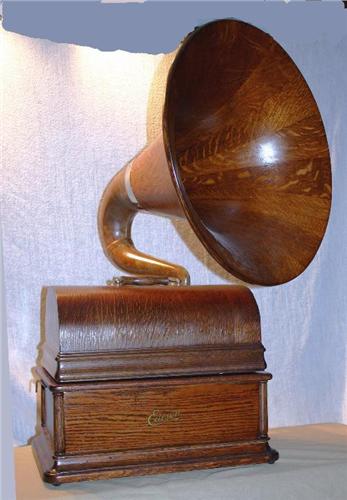Opera phonograph in oak with beautiful signet horn. Complete with lid. Excellent condition.