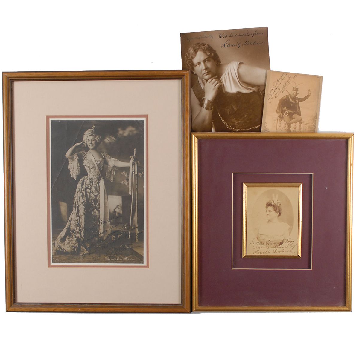Charming collection of four photos of various sizes, each signed by a notable opera singer, including: Lauritz Melchior, Edouard de Reszke, Marcella Sembrich, and Geraldine Farrar. In overall fine condition. Individual descriptions are as follows: