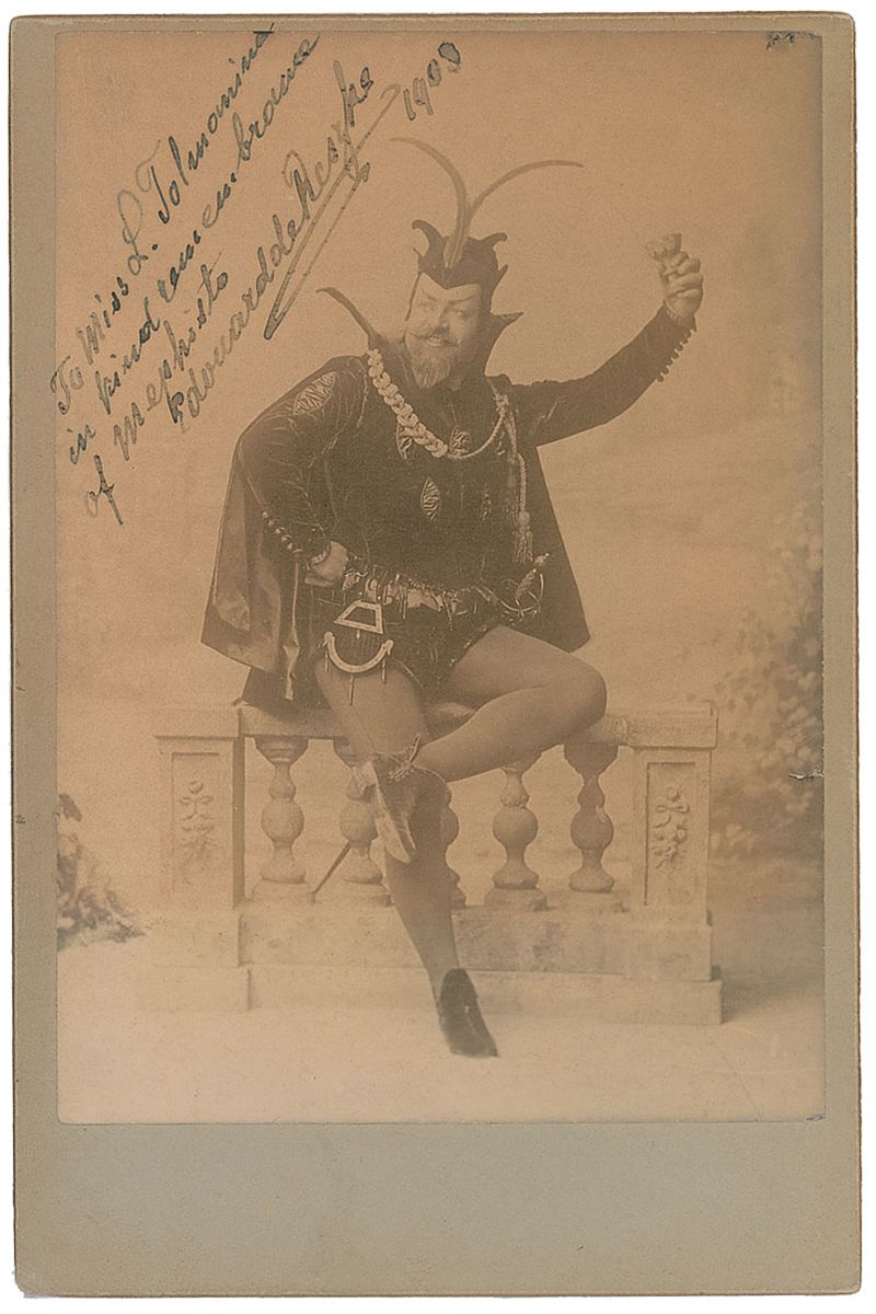 Edouard de Reszke: Original 4.25 x 6.5 cabinet photo of Reszke devilishly dressed as Mephistopheles, signed and inscribed in black ink, “To Miss L. Tolmomino, in kind remembrance of Mephisto, Edouard de Reszke, 1900.” In fine condition.