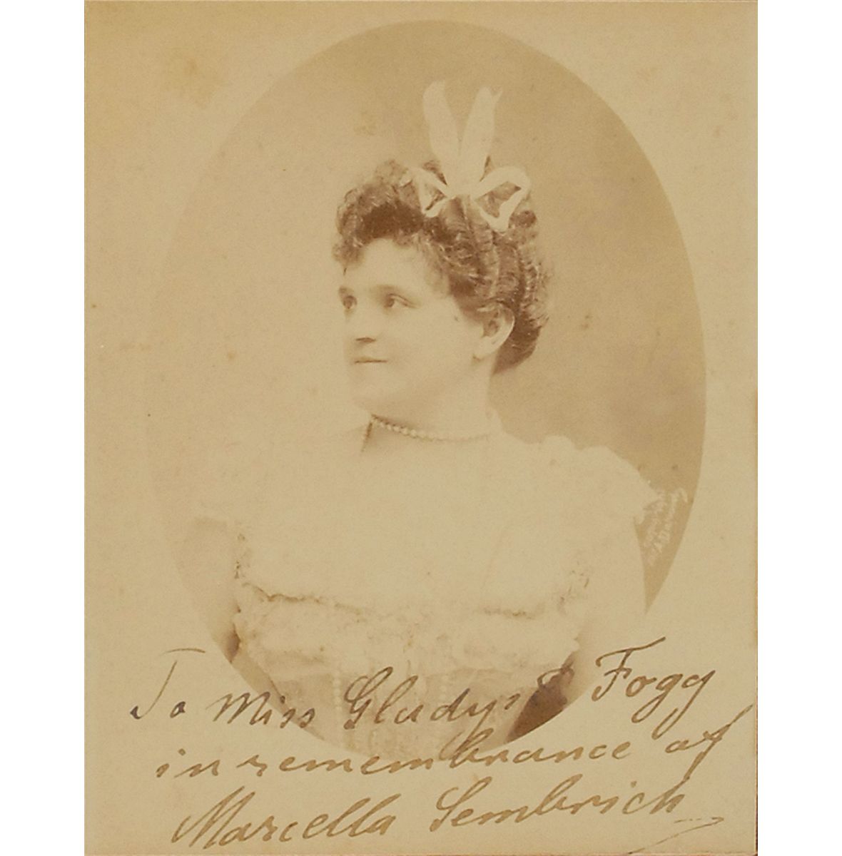 Marcella Sembrich: Original cabinet photo of Sembrich trimmed to 4 x 5.25, signed and inscribed in black ink, “To Miss Gladys P. Fogg, in remembrance of Marcella Sembrich.” Beautifully double-matted and framed to an overall size of 12 x 13.5. In fine condition.