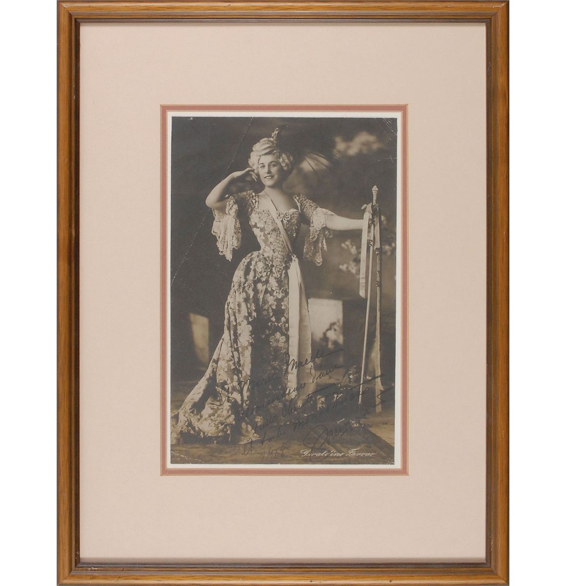 Geraldine Farrar: Vintage matte-finish 7 x 11 full-length photo of Farrar in a powdered wig and gown, inscribed in fountain pen, in French, and signed, “Geraldine Farrar 1908.” Double-matted and framed to an overall size of 14.25 x 18.5. In very good condition, with trimmed edges, and light creasing to three corner tips, with a more noticeable diagonal crease to top left.