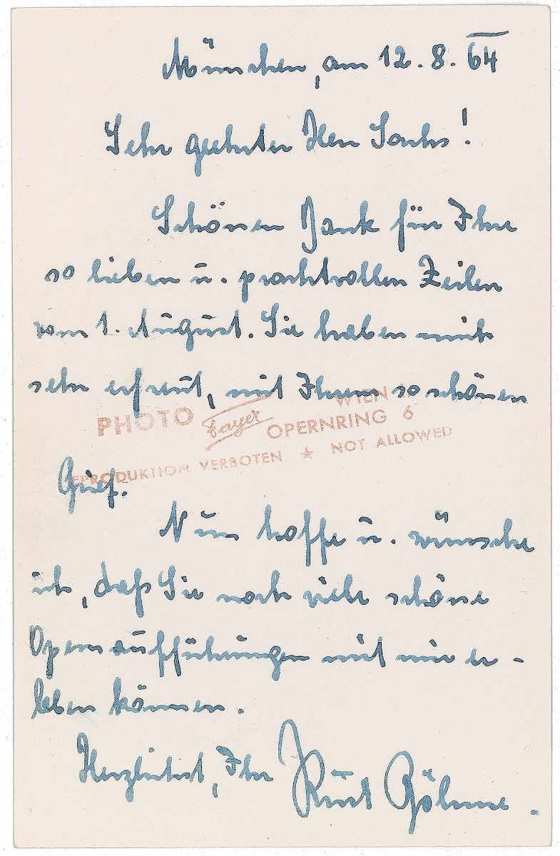 Five photos: one vintage pearl-finish 6.75 x 9.25 photo of Aureliano Pertile in Otello, signed and inscribed in fountain pen, and dated October 1941; one vintage 6 x 9 composite program photo of artists of the San Francisco Opera Company, signed in fountain pen by Jussi Bjoerling, Bidu Sayao, and Ezio Pinza; one vintage 3.5 x 5.5 cardstock photo of Kurt Bohme in costume, captioned in his hand in fountain pen, "Baron Ochs auf Lerchenau," with an ALS in German on the reverse about opera performances; one vintage 4 x 5.75 postcard photo of Dietrich Fischer-Dieskau in costume as Mandryka, signed in blue ink in the lower border, with an ALS in German on the reverse; and one vintage glossy 6.5 x 8.5 publicity photo of Gino Bechi, signed and inscribed in fountain pen, and dated May 31, 1939. In very good to fine condition, with scattered creases, foxing, and soiling to the two larger photos. Accompanied by the original mailing envelope for the Bohme photo.