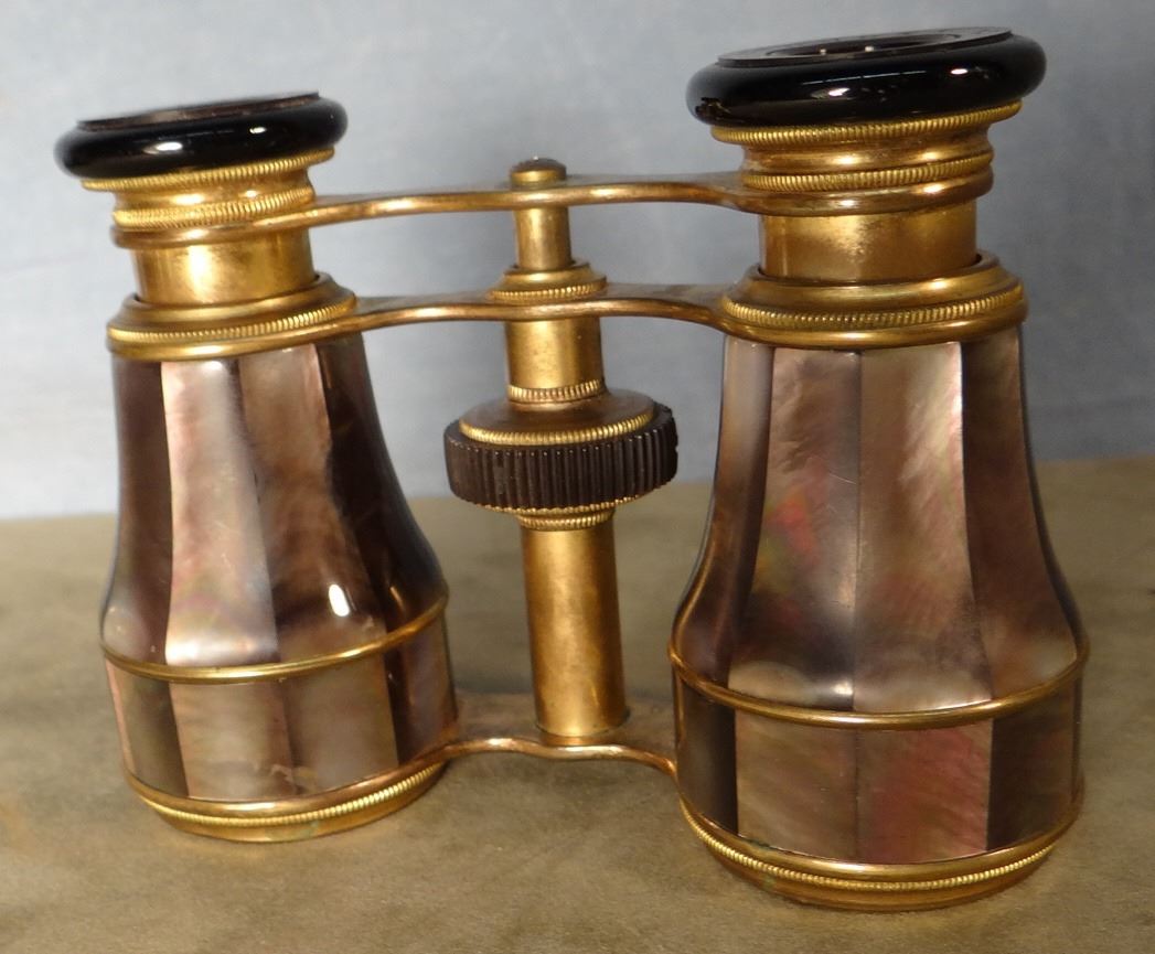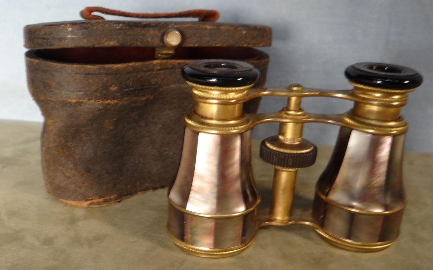 Opera glasses, Mother of Pearl, 1890's, 4" wide, in case. Colemont, Paris, France
