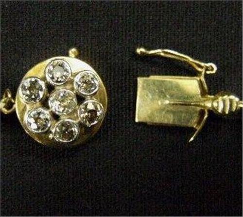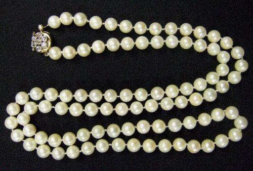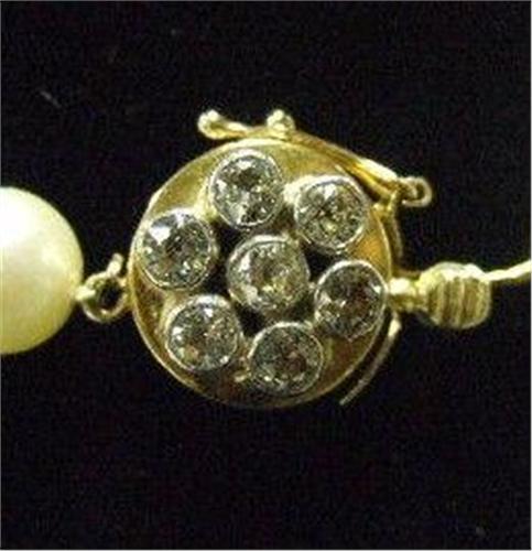 Opera length cultured pearl necklace with 14k gold and diamond clasp; 36 inch necklace is comprised of ninety-two cultured pearls approximately 8 mm in size; individually knotted; light cream color; 14k gold clasp is set with seven old mine cut diamonds; approximately 15 points each; stones are bezel set; clasp marked 14k (no visible defects)