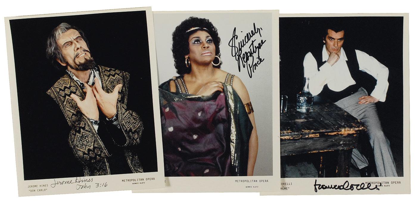 Three different color glossy 8 x 10 photos of different opera stars in character, each signed in black felt tip by the respective singer pictured. Signers are: Leontyne Price (Aida), Franco Corelli (La Boheme), and Jerome Hines (Don Carlo). In fine condition.