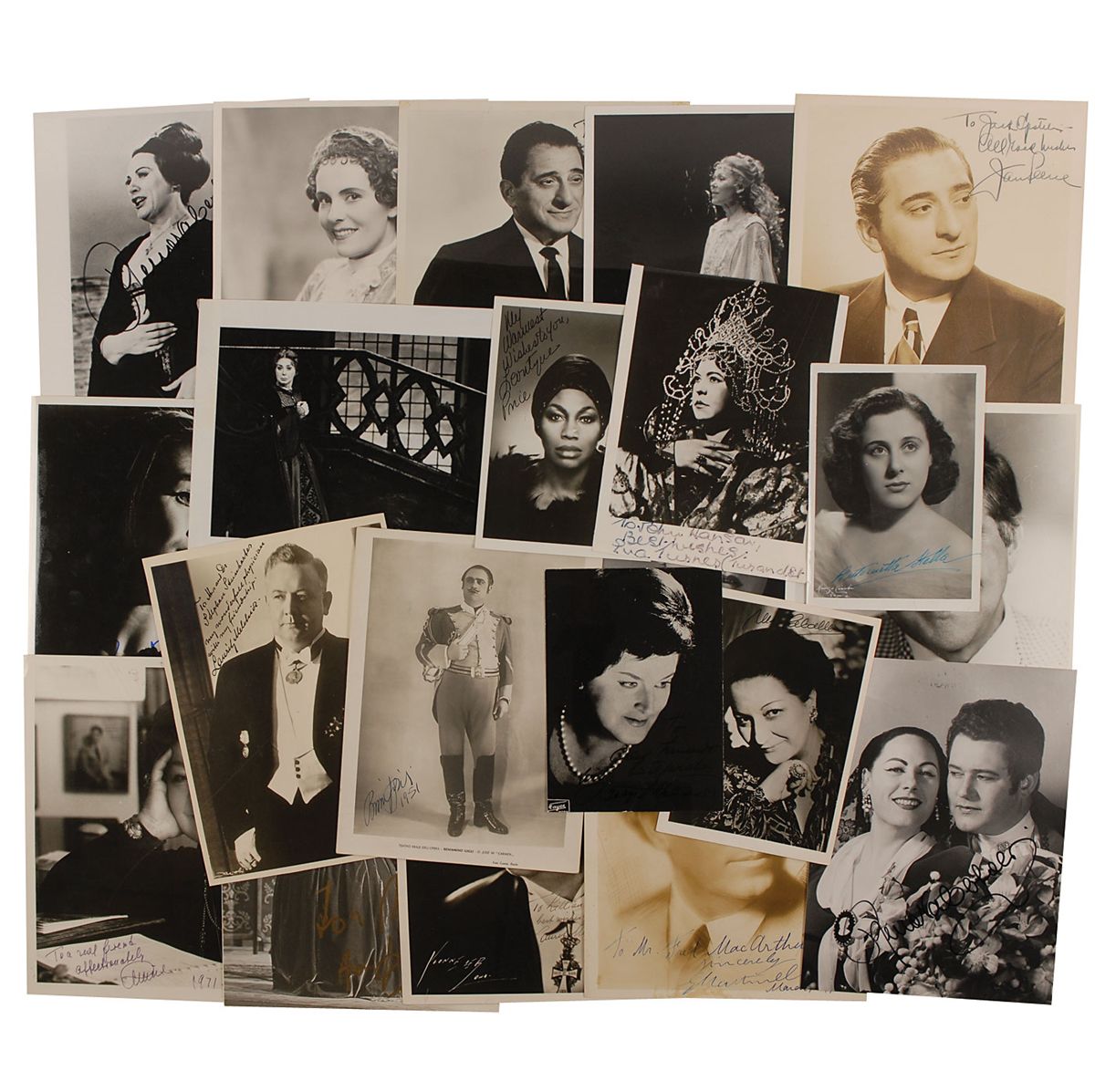 Twenty-three photos of various finishes, ranging in size from 4.75 x 6.75 to 8 x 10, each signed in ink by the opera singer pictured. Many are inscribed. Signers are: Giovanni Martinelli, Lauritz Melchior (2), Beniamino Gigli, Jan Peerce (2), Antoinette Stella, Montserrat Caballe, Birgit Nilsson, Leontyne Price, Joan Sutherland (2), Beverly Sills, Renata Scotto, Jarmila Novotna, Robert Merrill, Eva Turner, Renata Tebaldi (3), Jennie Tourel, Kiri Te Kanawa, and Maria Ivogun. In overall fine condition, with various scattered creases, light brushing to a few signatures, and trimmed edges to a few photos.