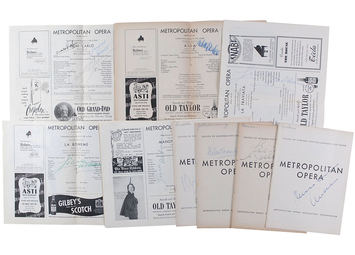 Collection of nine programs from the Metropolitan Opera House, various performances, all from the 1950s, each signed on the gatefold or front cover by a performer. Signers are: Licia Albanese (4); Fedora Barbieri; Helen Traubel; Hilde Gueden; Jerome Hines; Eleanor Steber; and Cesare Siepi; and one other. In fine condition, with expected handling wear.