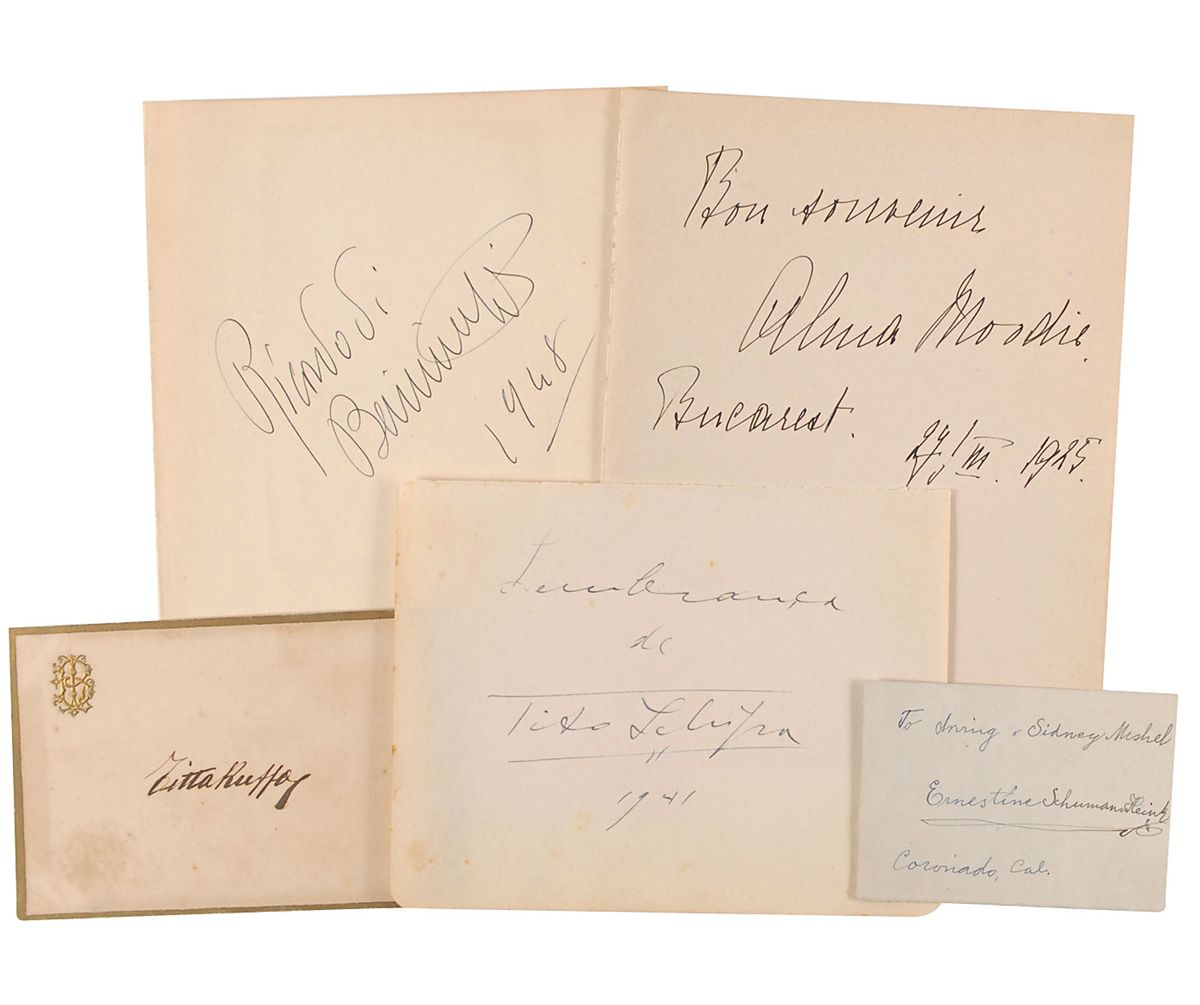 Five ink signatures of opera singers and musicians on individual sheets and cards, including: Alma Moodie, Titta Ruffo, Tito Schipa, Ernestine Schumann-Heink (ins), and Beniamino Gigli. In overall very good to fine condition.