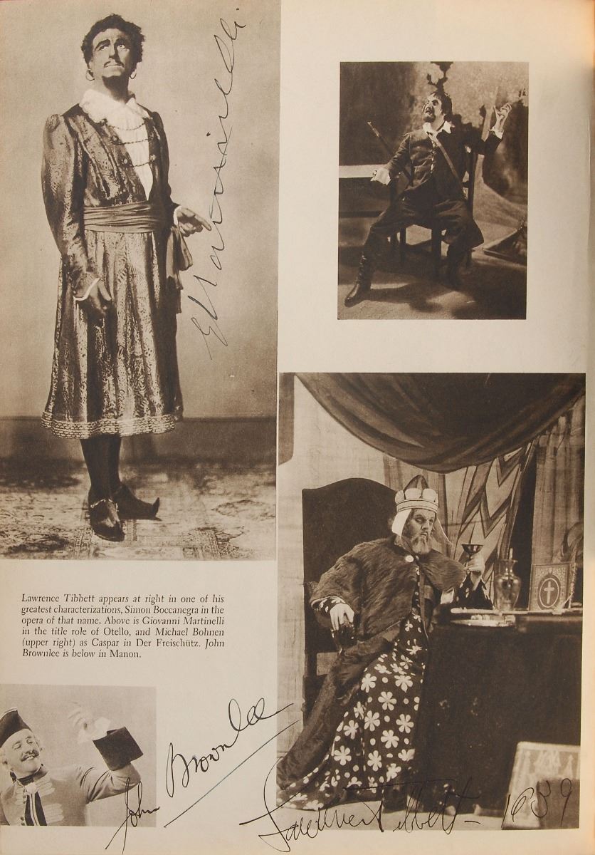 Signed book: Opera Cavalcade. NY: The Metropolitan Opera Guild, 1938. Hardcover, 9.25 x 12.25, 68 pages. Signed throughout in ink by numerous opera figures, including Edward Johnson, Kirsten Flagstad, Lily Pons, Ezio Pinza, Lawrence Tibbett, Giovanni Martinelli, Grace Moore, Marjorie Lawrence, Wilfred Pelletier, and Gennaro Papi. In fine condition.