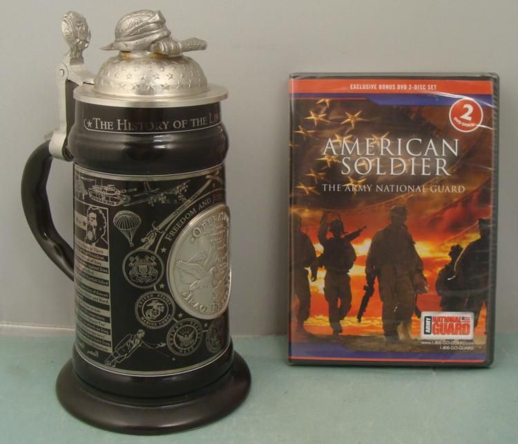 These items are tributes to America's military. * First is a limited edition Operation Iraqi Freedom beer stein. This classic style stein was made in Germany from a design by Joadrian Malesca. It is ceramic with pewter top and front plaque. The half liter size is 9" tall and 4 3/4" in diameter. There are terrific details, including a timeline of the Iraq War. It is in excellent condition. * The DVD is a 2 disc set is titled "American Soldier: the Army National Guard." It is full of historic footage of their heroic battles, and missions, plus an interactive PC game. It is sealed and in mint condition. * These are two terrific modern military items, already collectors items.