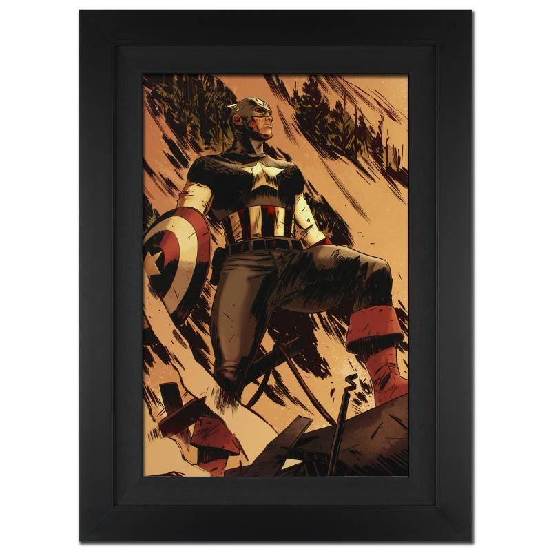 A piece of comic book history, this limited edition, from original art by Mitchell Breitweiser, depicts an iconic image of Captain America. Since 2005, Mitchell Breitweiser has been penciling, inking, and painting his way through dozens of Marvel comic books and covers. Mitch has left a lasting impression with his Captain America books, including 2010's Captain America: Patriot Mini Series. "Operation Zero-Point #1" is a limited edition giclee on canvas by Mitchell Breitweiser presented by Marvel Comics, hand signed by the great Stan Lee and numbered out of only 10! This piece has been custom framed and is ready to hang! Includes Certificate of Authenticity! Measures approx. 25" x 34" (with frame); 18" x 27" (image).